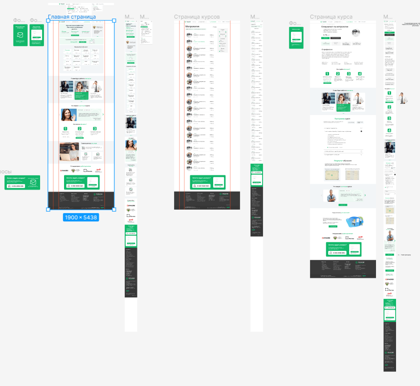 Далее в Figma мы нарисовали несколько основных страниц и элементов оформления в вариантах для компьютерных дисплеев и смартфонов
