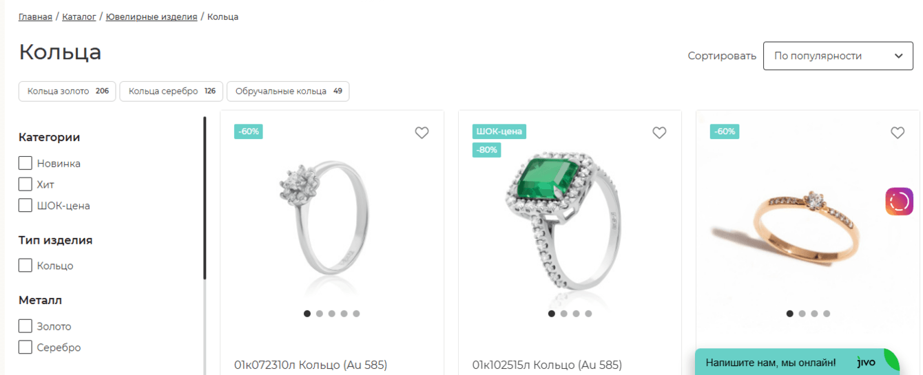**Каталог.** Реализована многоуровневая структура категорий: кольца, серьги, подвески, браслеты, цепи. Для каждой категории настроен свой набор параметров фильтрации. Значения фильтров подтягиваются автоматически из выгрузки 1С — добавляются и скрываются в зависимости от актуальных остатков.