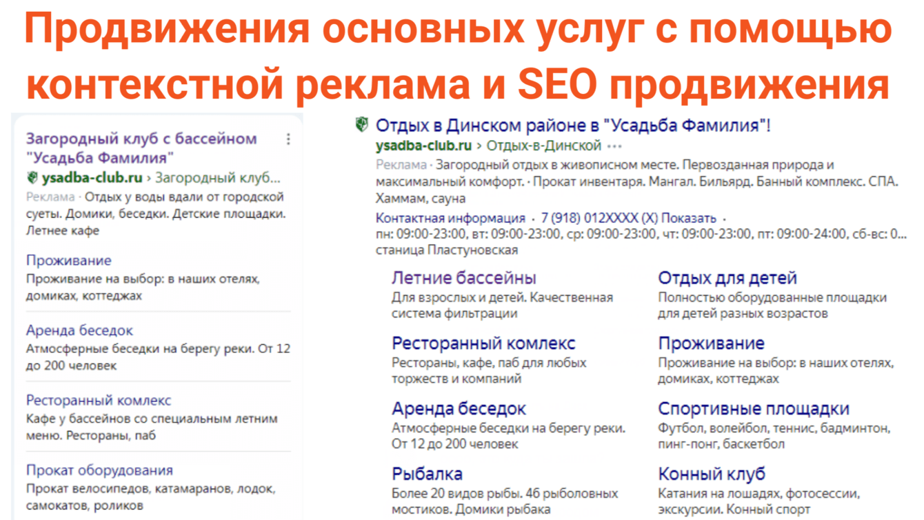 Также запустили контекстную рекламу по сезонным направлениям (свадьбы, летний отдых с бассейном, празднование Нового Года и т. д.)
