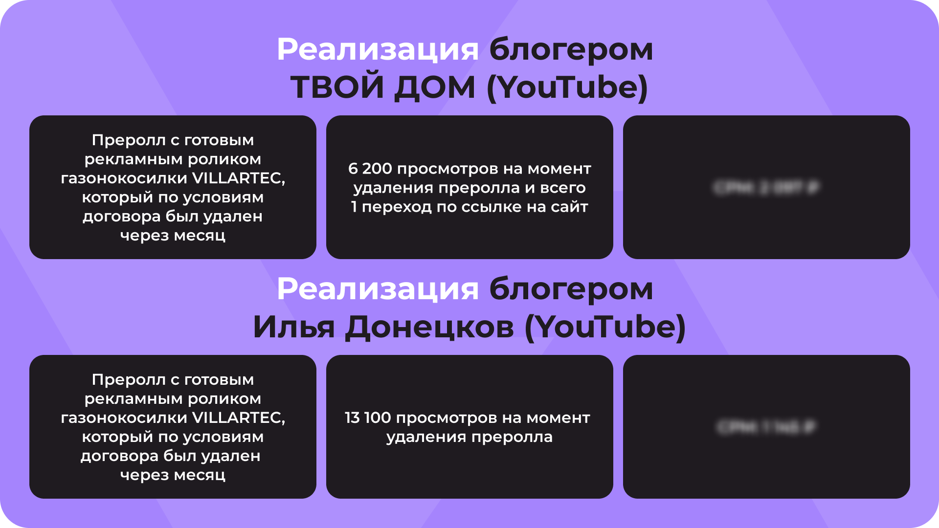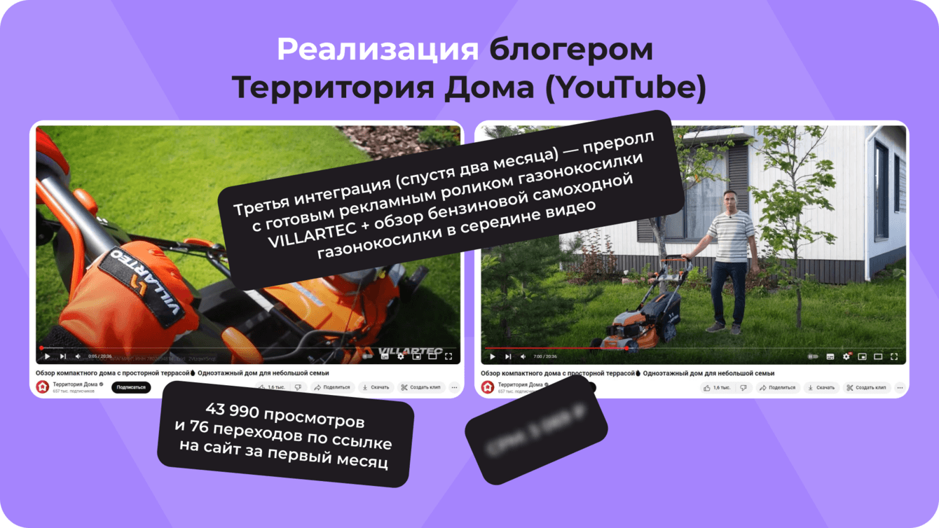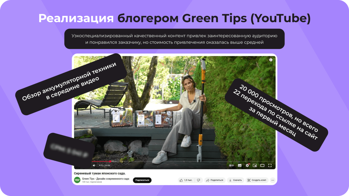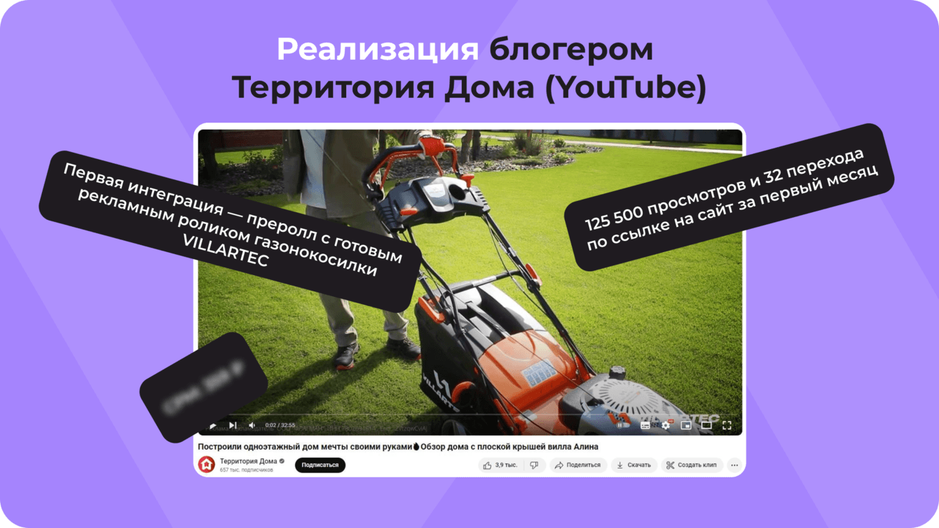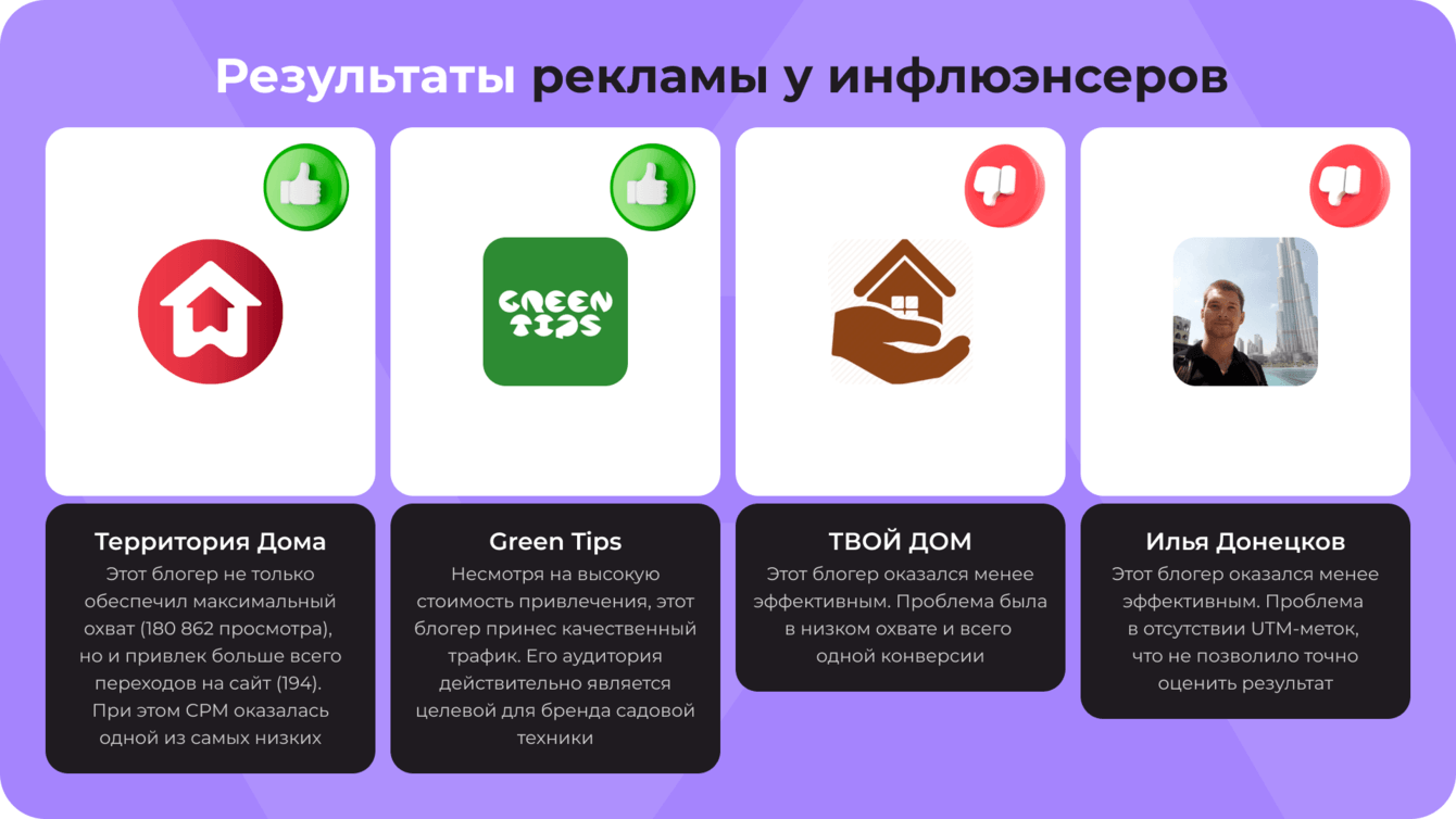 По окончании срока интеграции выяснилось, что у блогера Илья Донецков не было UTM-метки в ссылке, поэтому оценить эффективность не удалось. А в случае ТВОЙ ДОМ, видимо, зрителям интереснее было слушать о строительстве своими руками, чем о дальнейшем уходе за участком, т.е. в целевую аудиторию мы попали не точно.