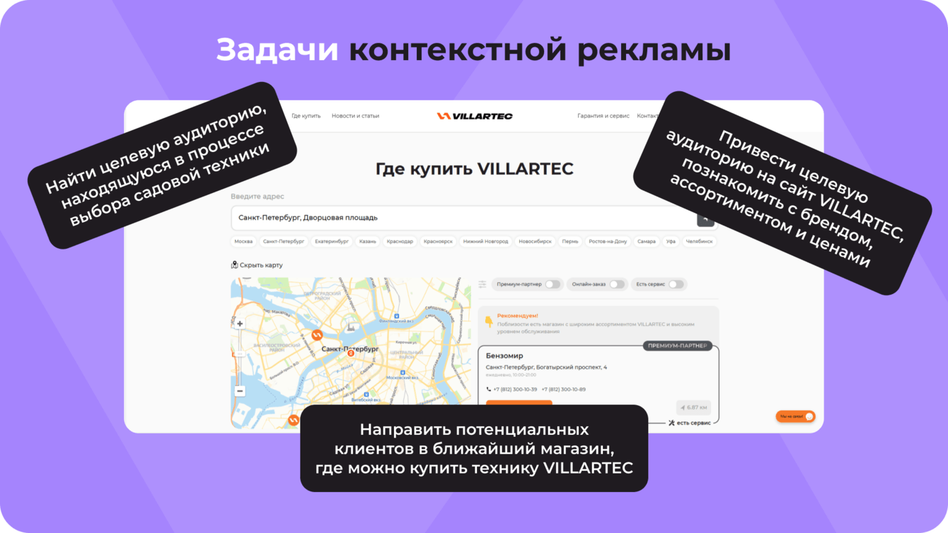 При работе над контекстной рекламой для нового бренда садовой техники VILLARTEC мы придерживались brandformance-подхода. Основная идея такого подхода, заключается в том, чтобы не просто продвигать бренд, создавая узнаваемость и поддерживая лояльность, но и одновременно добиваться измеримых результатов «здесь и сейчас», чем характерен инструмент контекстной рекламы. Ранее реклама по данному проекту не запускалась, а сайт был только что сделан, поэтому нам предстояло быть первооткрывателями.