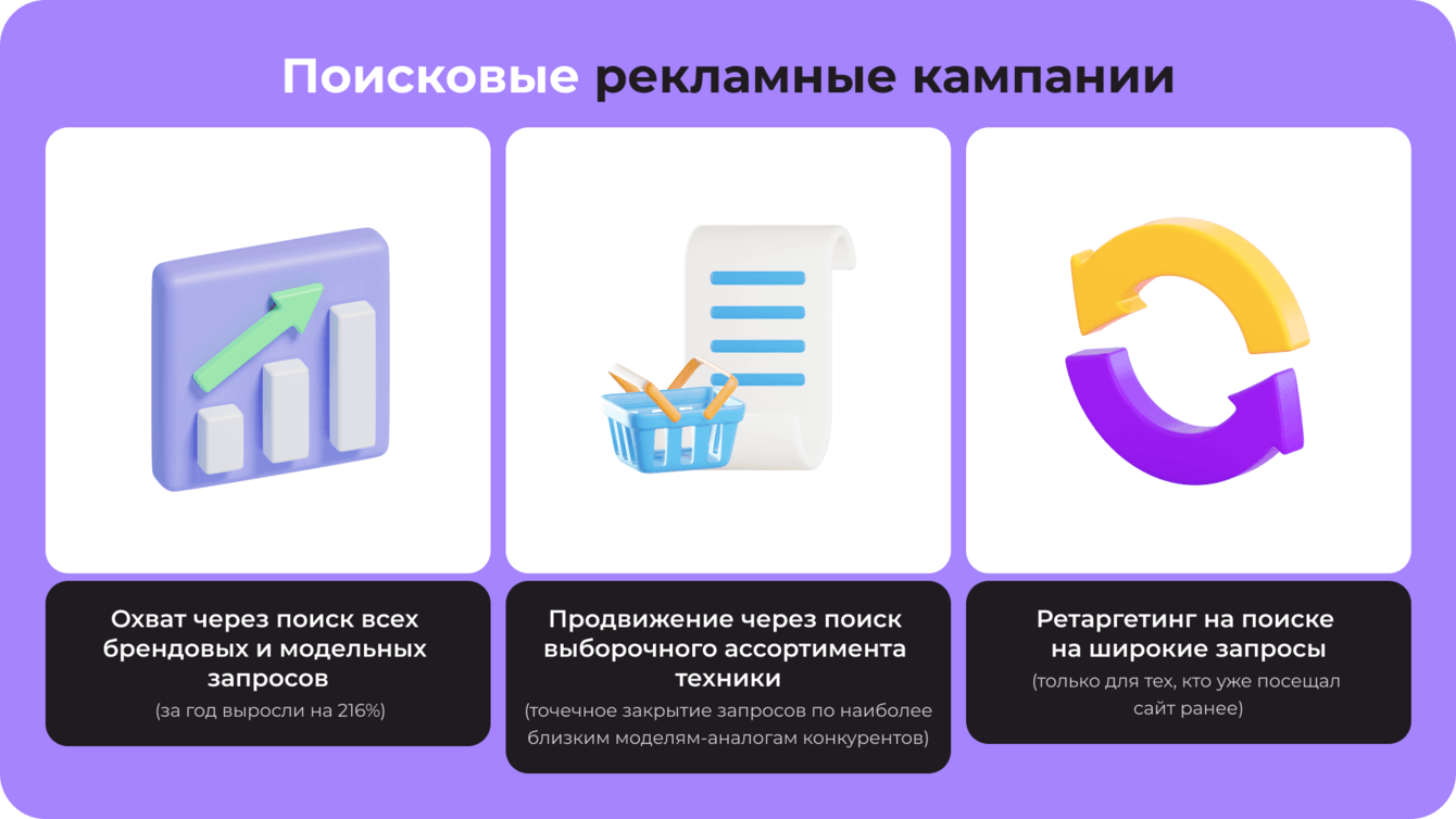 Что касается поиска, то большую часть поисковой выдачи здесь плотно занимают крупные интернет-магазины и маркетплейсы, поэтому поисковые РК работали точечно.