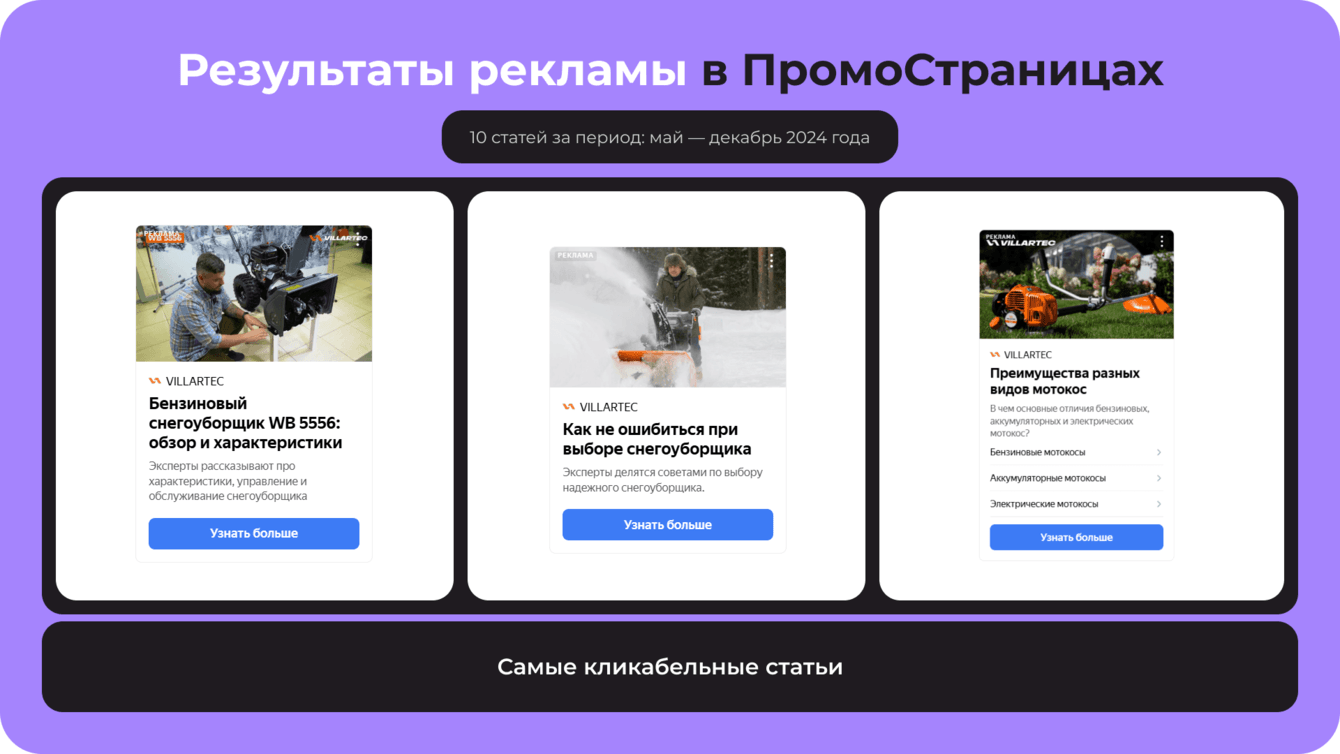 Комбинирование brandformance-подхода с современными инструментами контекстной рекламы позволило нам не только достичь измеримых результатов в краткосрочной перспективе, но и заложить основу для долгосрочного роста бренда VILLARTEC. Достигнутые результаты подтверждают эффективность выбранной стратегии в которой охватные инструменты органично сочетаются с конверсионными стратегиями. В 2025 году мы планируем расширять наши РК на новые регионы и еще достигать еще больших результатов на основе полученного за 2024-й год опыта.