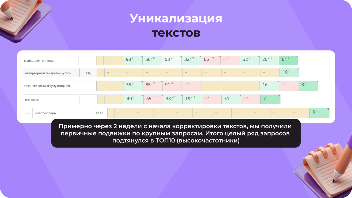 Для уникализации текстов мы привлекали только копирайтеров с техническим образованием и опытом работы с садовой техникой. Для проверки уникальности пользовались сервисом etxt, для проверки на переспам – advego.