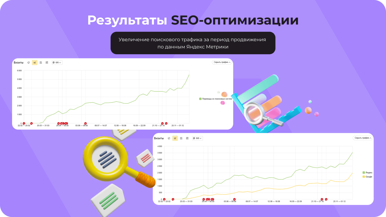 - запросный индекс вырос с 0 до 320 запросов в ТОП10 по Яндекс и Google.