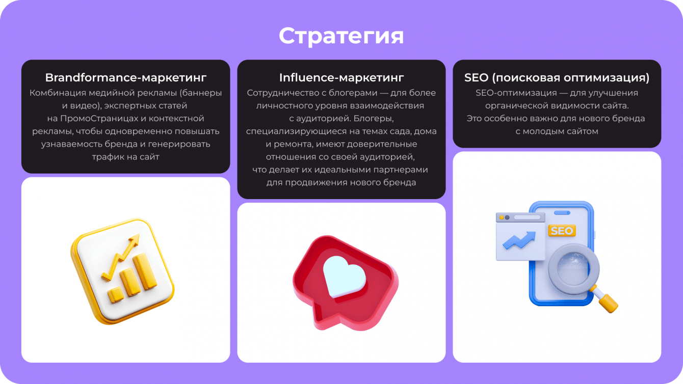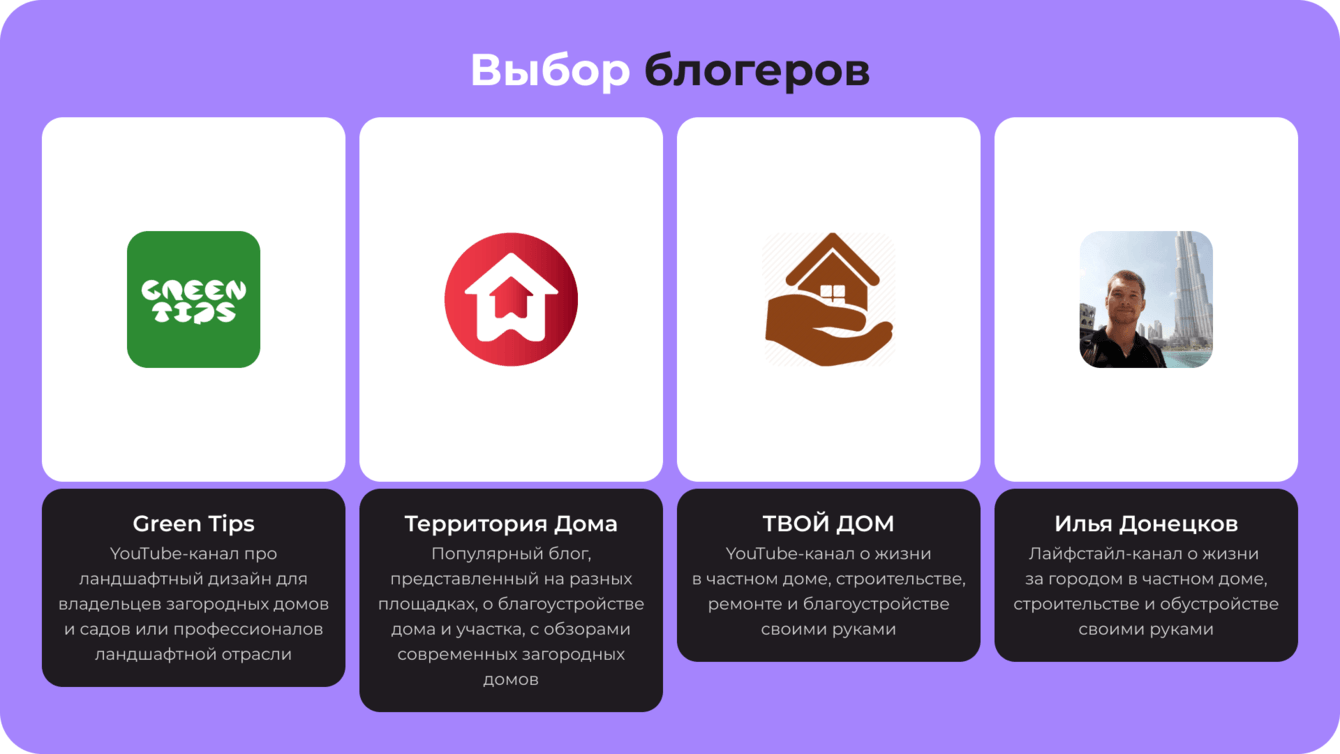 Мы предложили клиенту формат сотрудничества с блогерами, так как это один из самых быстрых способов достучаться до целевой аудитории. Блогеры, специализирующиеся на темах сада, дома и ремонта, имеют доверительные отношения со своей аудиторией, что делает их идеальными партнерами для продвижения нового бренда.
