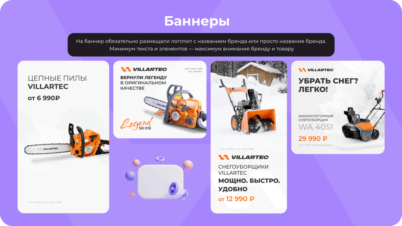 Баннеры показывали с разными товарами в зависимости от сезона. Ведь мало кому нужны воздуходувки зимой, как и снегоуборщики — летом.