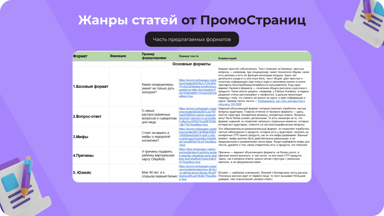В запуске также очень помогли жанры статей от команды ПромоСтраниц. Целая табличка, в которой, как в меню, расписаны все приемы, которые можно использовать при выборе темы и написании статьи.