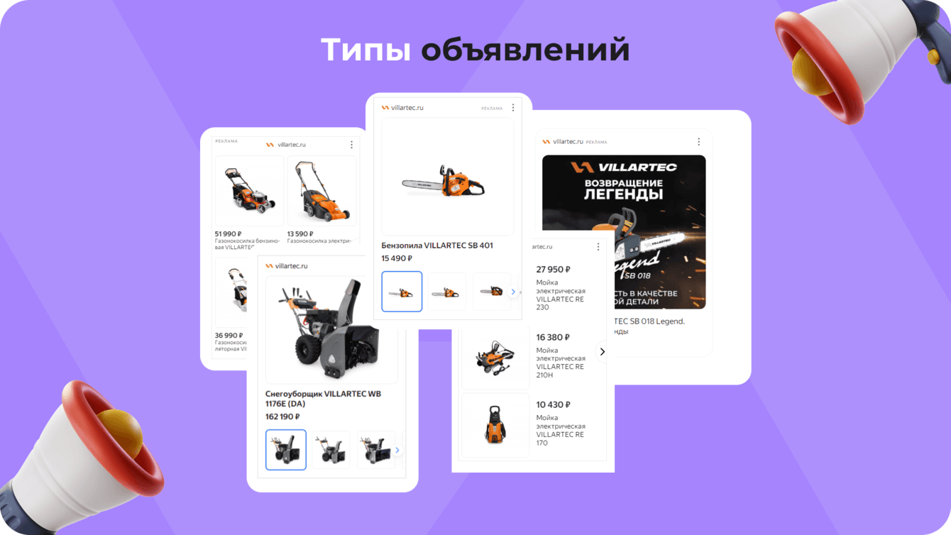 В наших РК мы использовали все доступные типы объявлений: от привычных для e-commerce товарных объявлений, классических текстово-графических с текстом, изображениями или видео, до самых новых форматов – объявлений «страницы каталога».