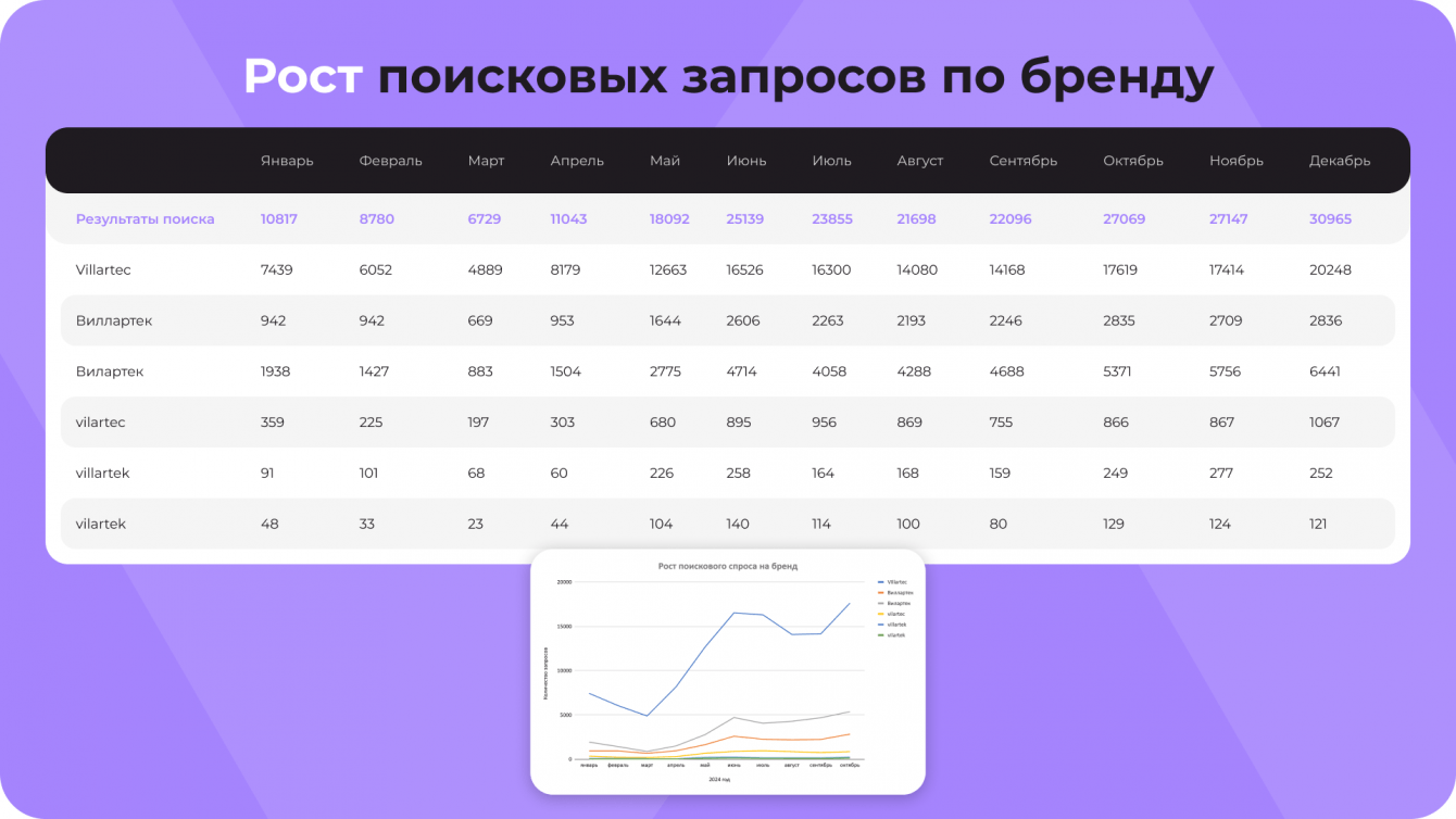 - с 7 439 запросов в январе до 20 248 в декабре для основного названия «VIllartec»;