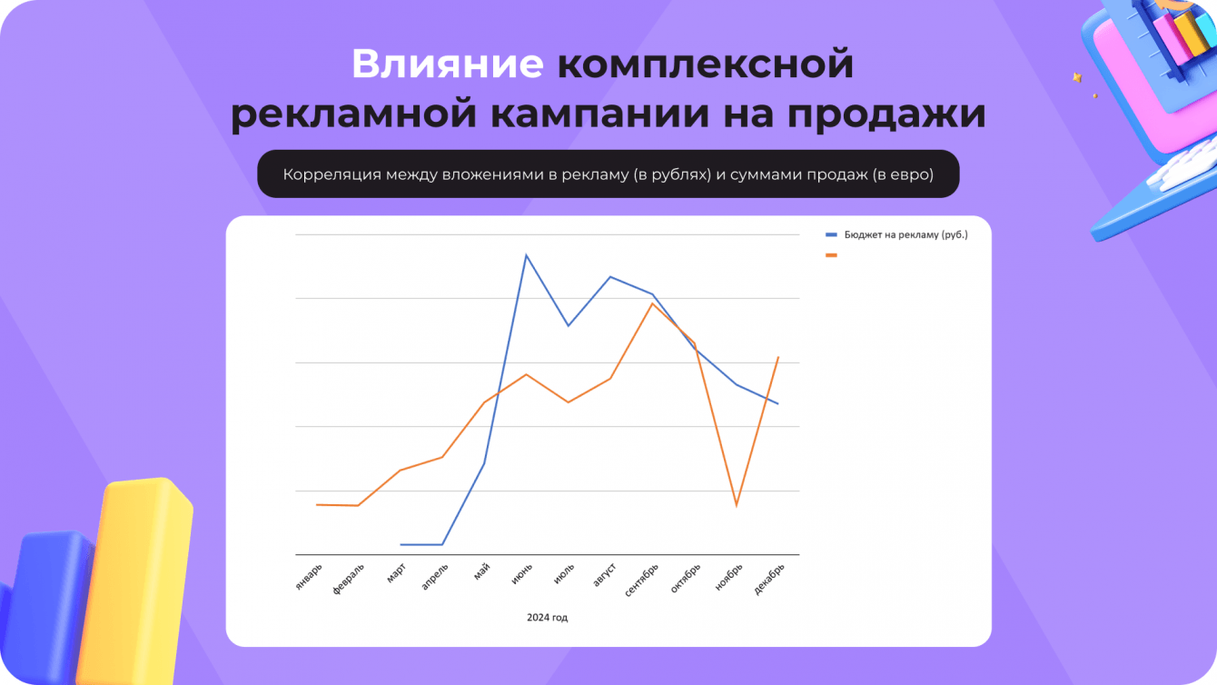 Несмотря на отсутствие прямого влияния на конверсии, отследить корреляцию между рекламными активностями и изменениями в количестве продаж можно наглядно.