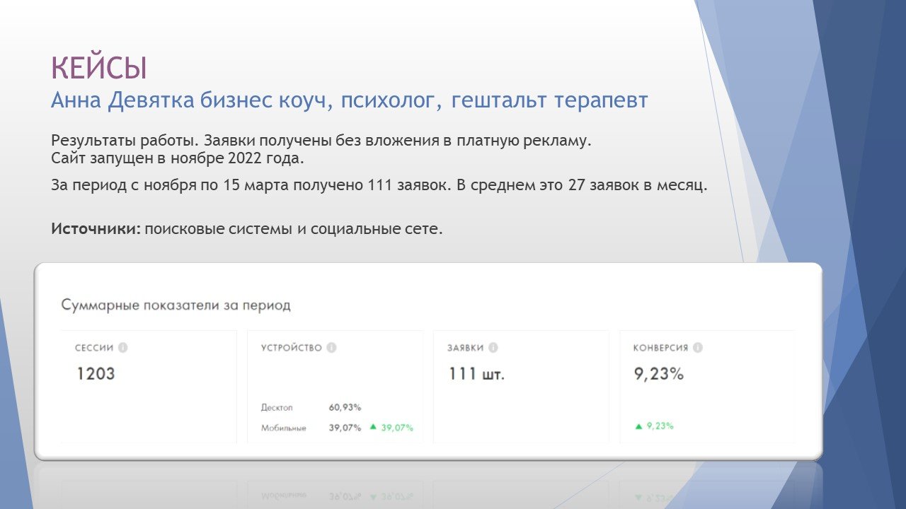 Разработан сайт и получены первые лиды. Закрытие свободных окон. Повышен индекс доверия к эксперту и личному бренду.