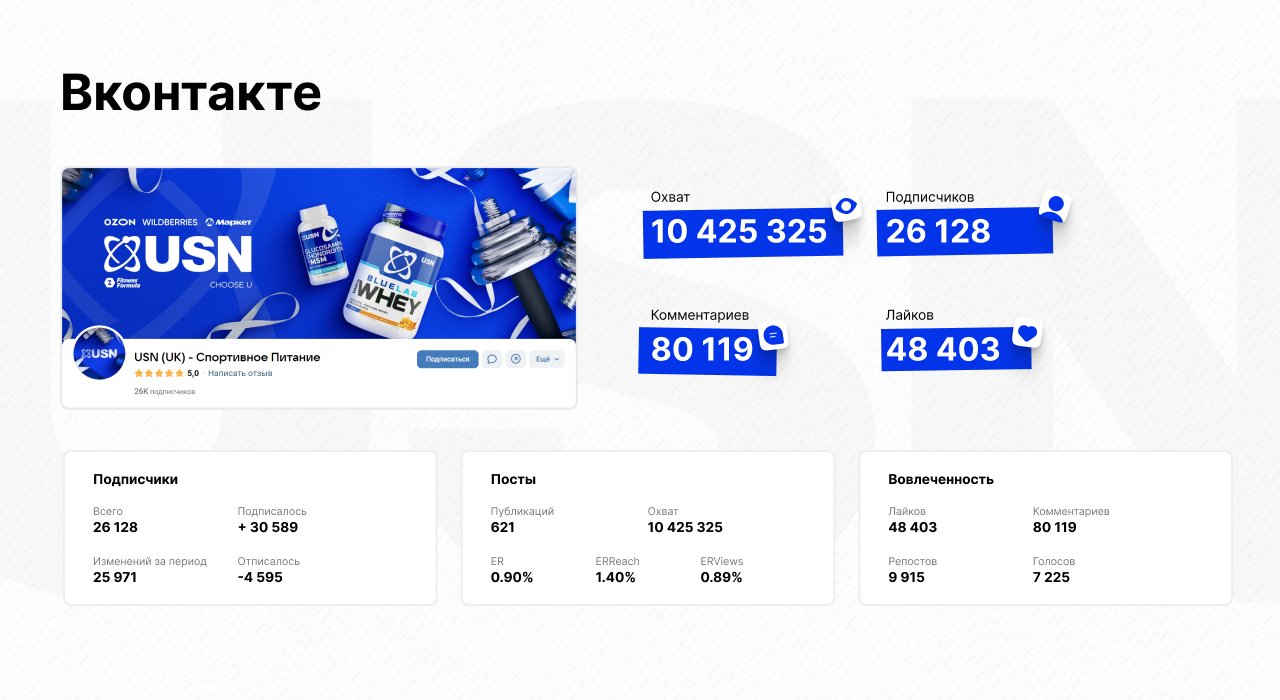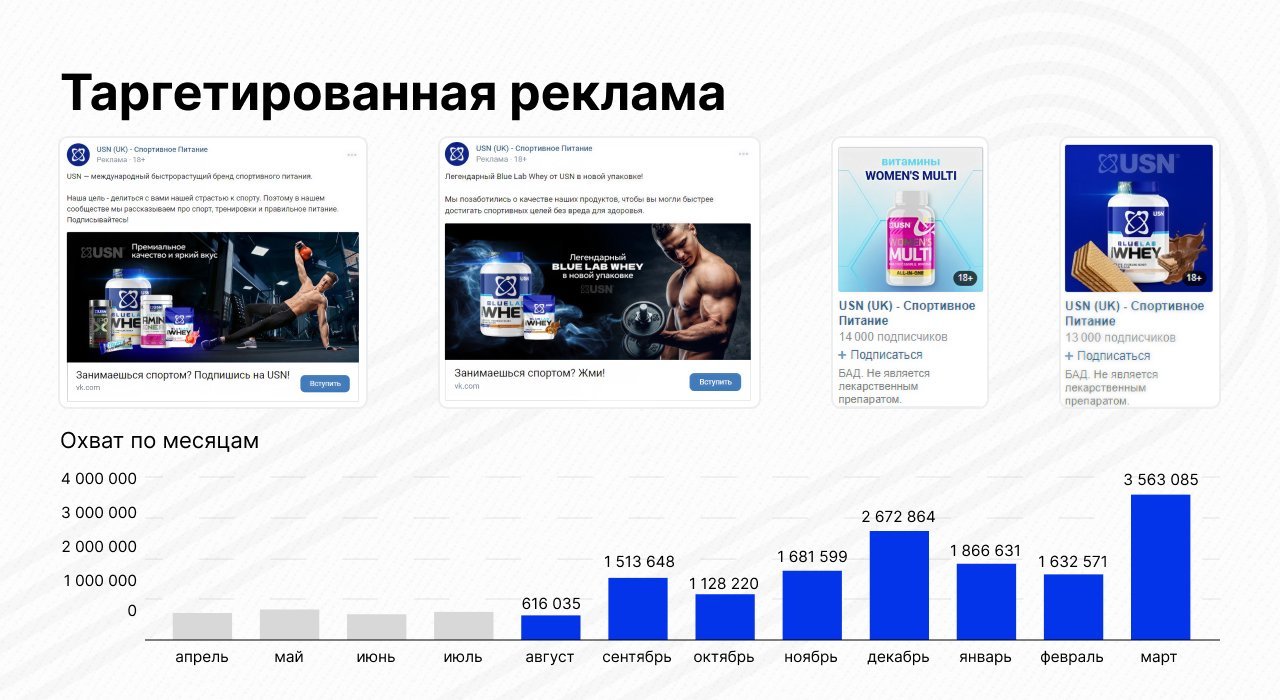 А также запускали РК по ключевым запросам «спортивное питание» и промотировали посты для поднятия вовлеченности в сообществе ВК.