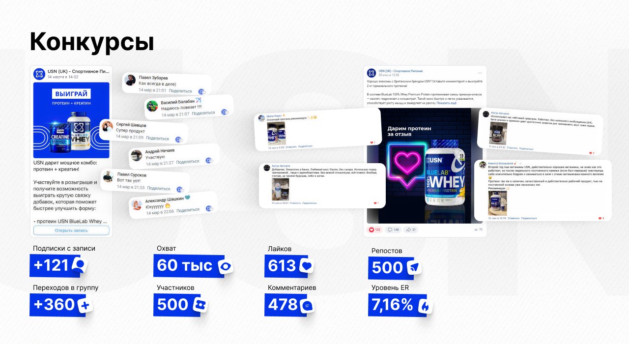 Так в своей работе мы регулярно использовали различные конкурсы с ценными призами и промокодами. Получаем много реакций, подписчиков и настоящих отзывов с фотографиями на продукцию USN.