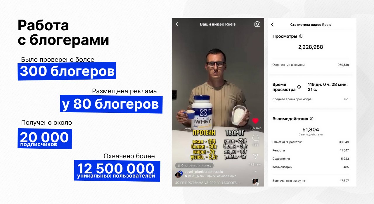 За время работы по инфлюенс-маркетингу было проверено более 300 блогеров, размещена реклама у 80 блогеров, получено около 20 000 подписчиков и охвачено более 12 500 000 уникальных пользователей Instagram.