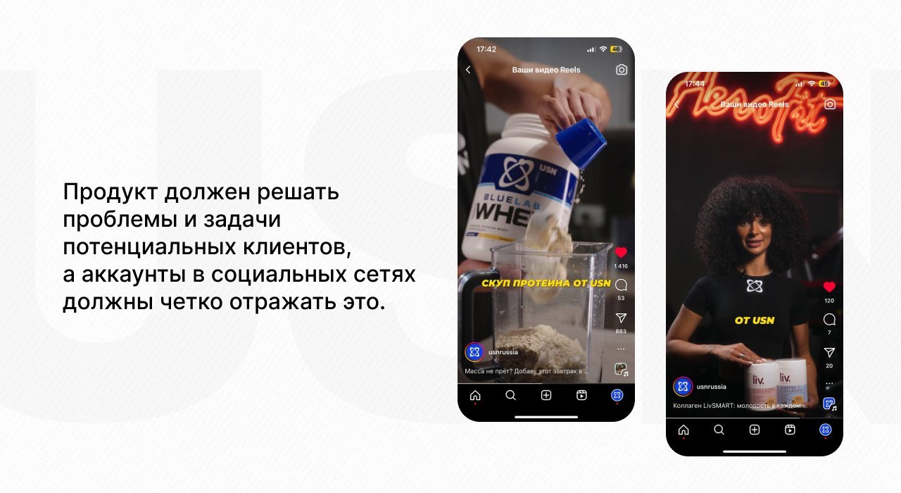 За два года интенсивной работы с социальными сетями USN мы создали активное сообщество, где все увлечены спортом. С появлением новых целей перед SMM возникла задача поддержания этого сообщества, предоставляя подписчикам контент, который они ожидают от эксперта в области спортивного питания и эффективных тренировок.