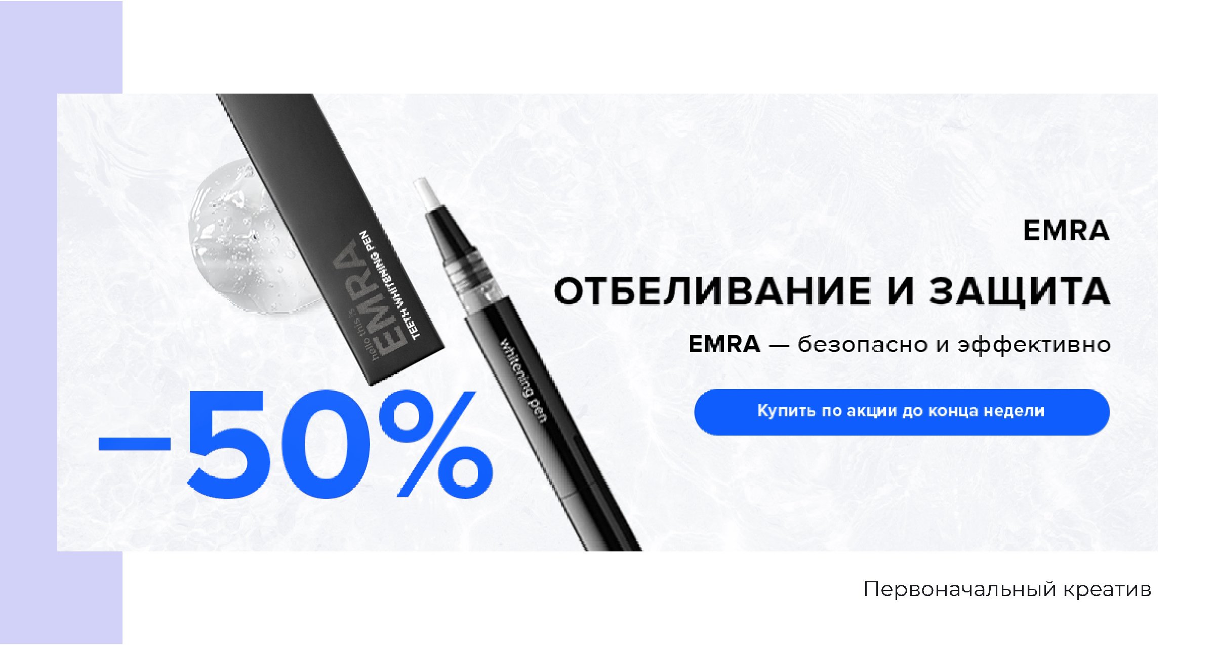 Расскажем один из случаев. Сначала мы запустили медийную рекламу на карандаши для отбеливания зубов. Несмотря на точно собранную целевую аудиторию, первые креативы не достигли и 0,4% CTR. Предположили, что клиент не понимает, что это за товар. Карандаши для отбеливания пользуются наименьшей популярностью среди средств для гигиены полости рта, так как не являются ежедневным уходом.