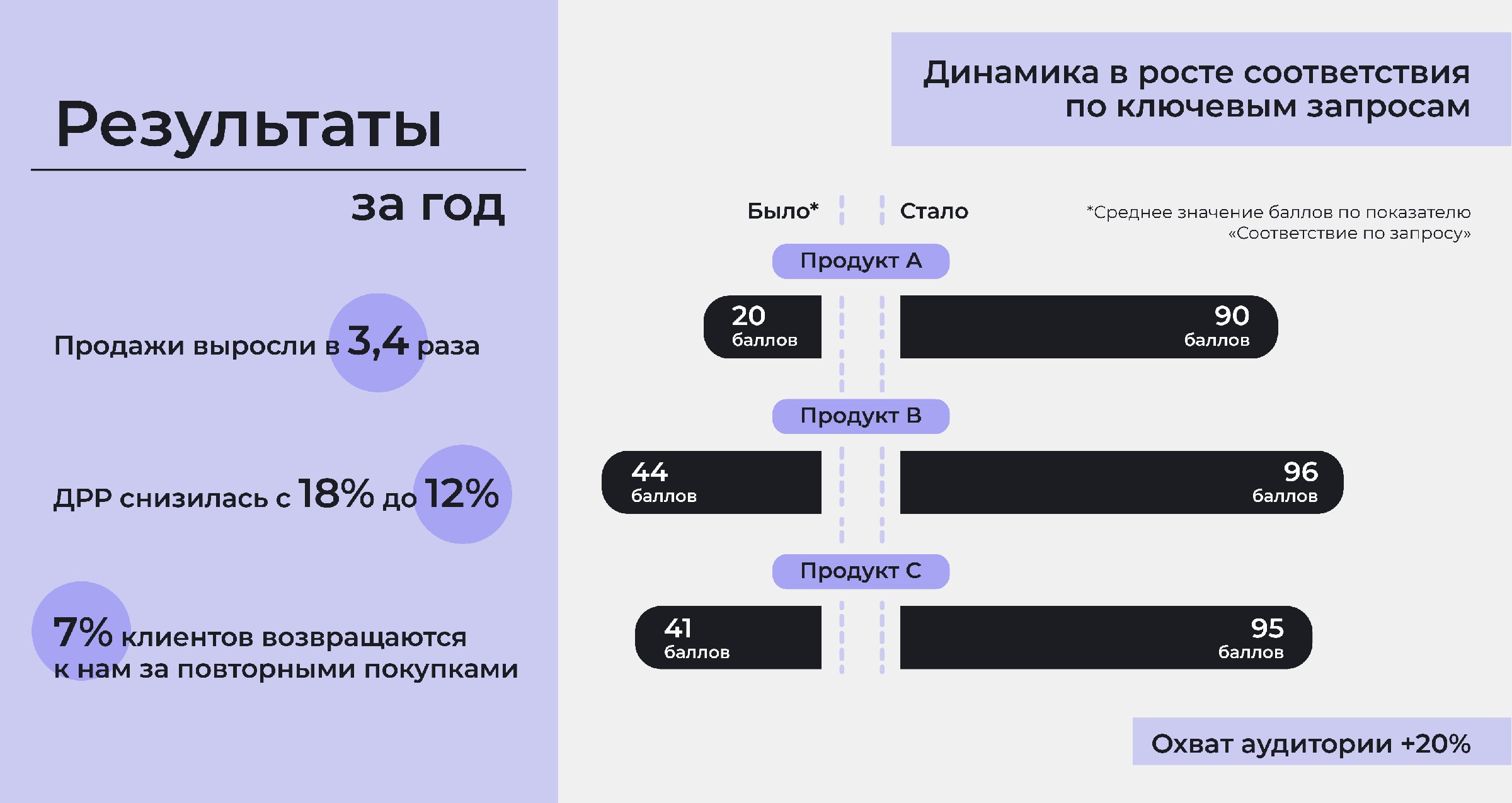 – SEO. Все карточки показали динамику в росте соответствия по запросам со среднего значения 20 баллов до 90, что помогло нам снизить рекламный расход и увеличить охват аудитории по категориям в среднем на 20%.