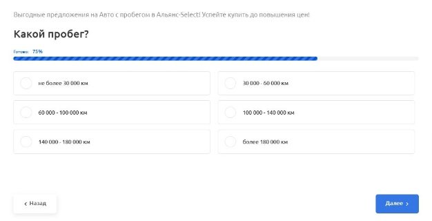 В 2020 году мы запустили лидогенерационную кампанию, основанную на квизе. Этот формат позволял потенциальным покупателям быстро и увлекательно ознакомиться с предложениями компании и оставить заявку на интересующие их автомобили. Стоимость привлечения одного лида (CPL) составила в среднем 388,36 рублей. Эта кампания показала высокую эффективность в плане вовлечения аудитории и привлечения потенциальных покупателей.