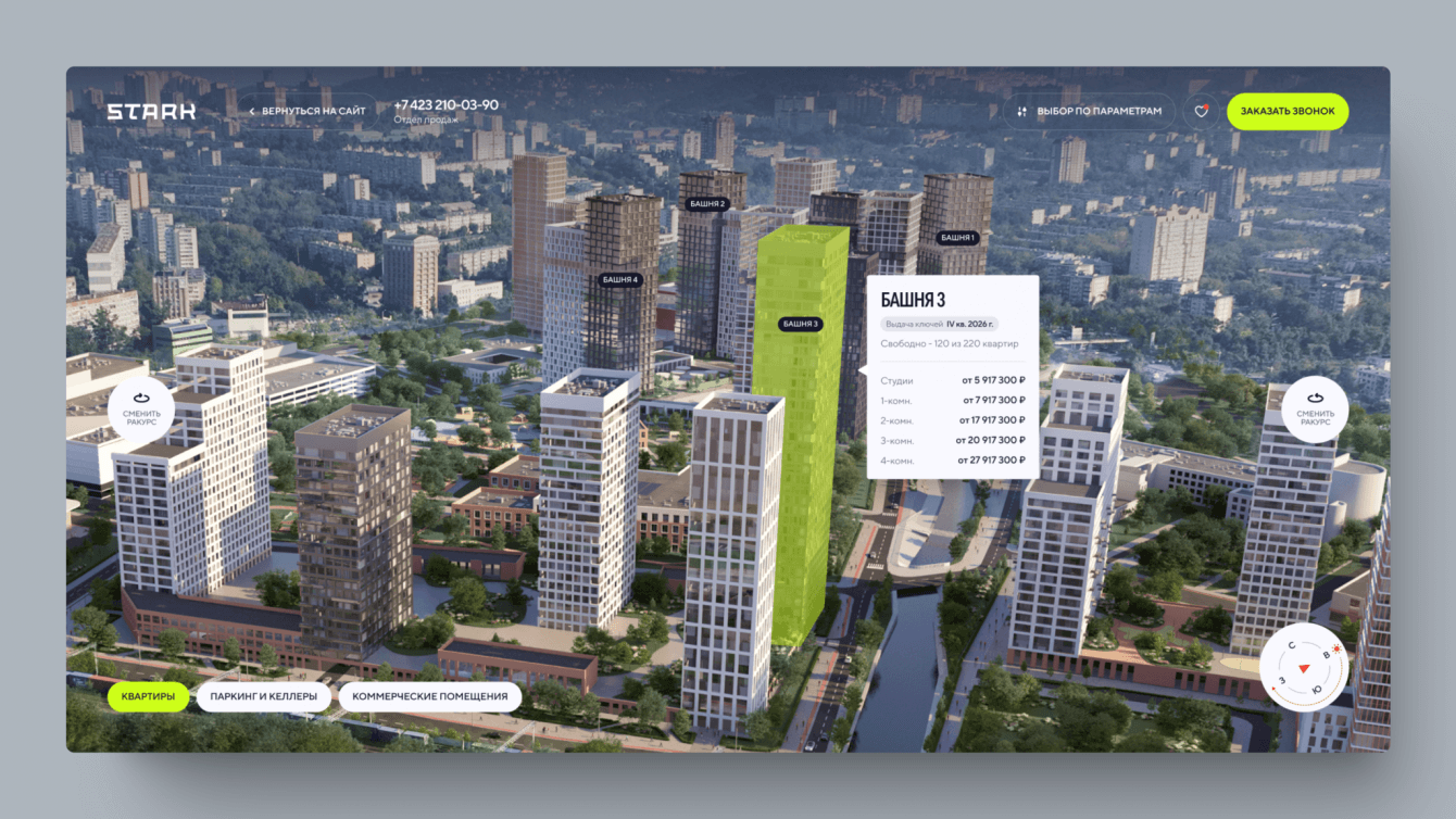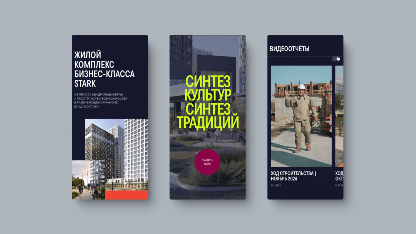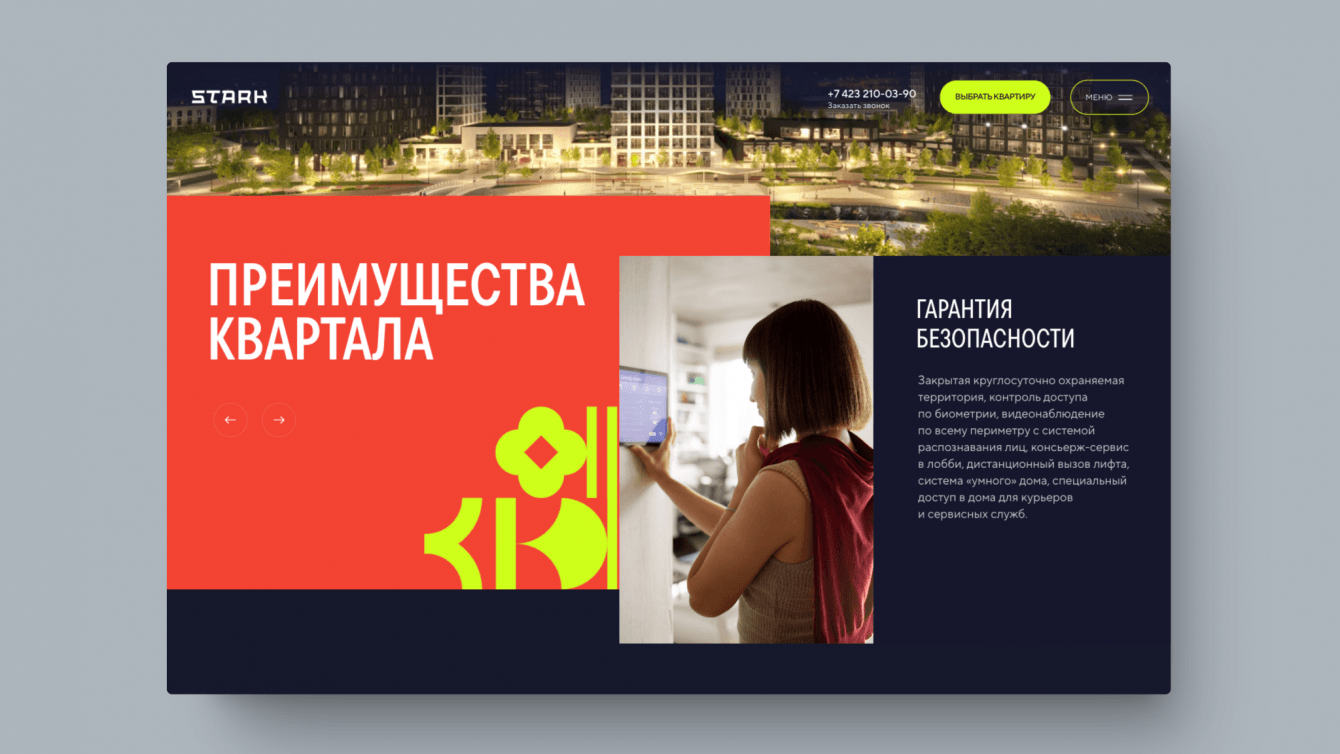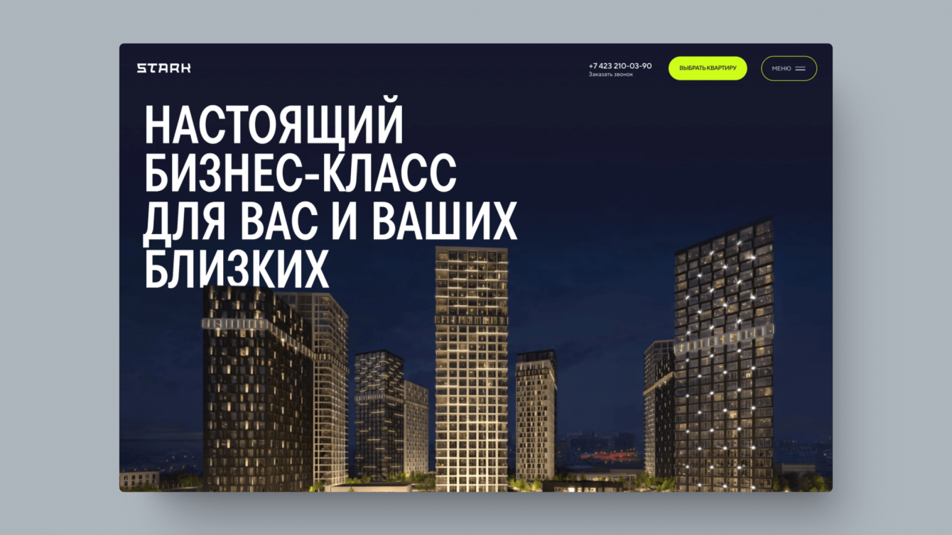 Задача сайта жилого квартала – повысить лояльность потенциальных покупателей и получить заявки в отдел продаж. Нам необходимо было создать сайт, который поможет клиентам понять, что перед ними не просто квадратные метры, а возможность повысить комфорт своей жизни. Важно было показать ценность ЖК STARK для потенциальных покупателей, которая оправдывает высокую стоимость квадратного метра.