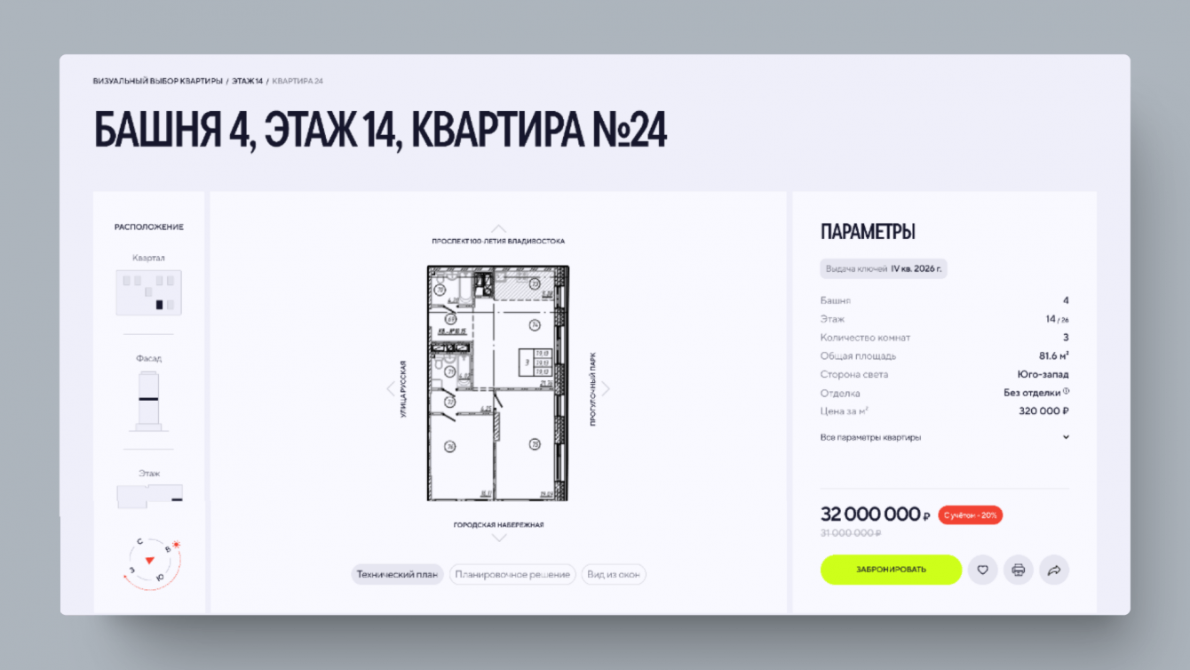 Система включает в себя выбор квартир визуально и по параметрам. Мы постарались сделать карточку квартиры максимально информативной, чтобы человек мог увидеть всё сразу: от положения дома в квартале до действующих акций. Это позволяет пользователю, не покидая карточку, получить ответы на все ключевые вопросы. В результате карточка квартиры работает как самостоятельный продающий лендинг, который можно отправить друзьям или членам семьи.