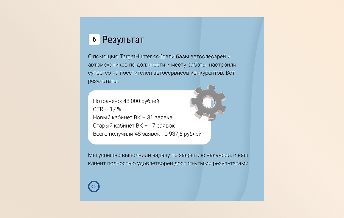 Для поиска автослесарей и автомехаников мы применили парсер TargetHunter, собрав базу специалистов по должности и месту работы. Это позволило нам точечно таргетироваться на нужных кандидатов, исключив нерелевантные показы и оптимизировав рекламный бюджет.