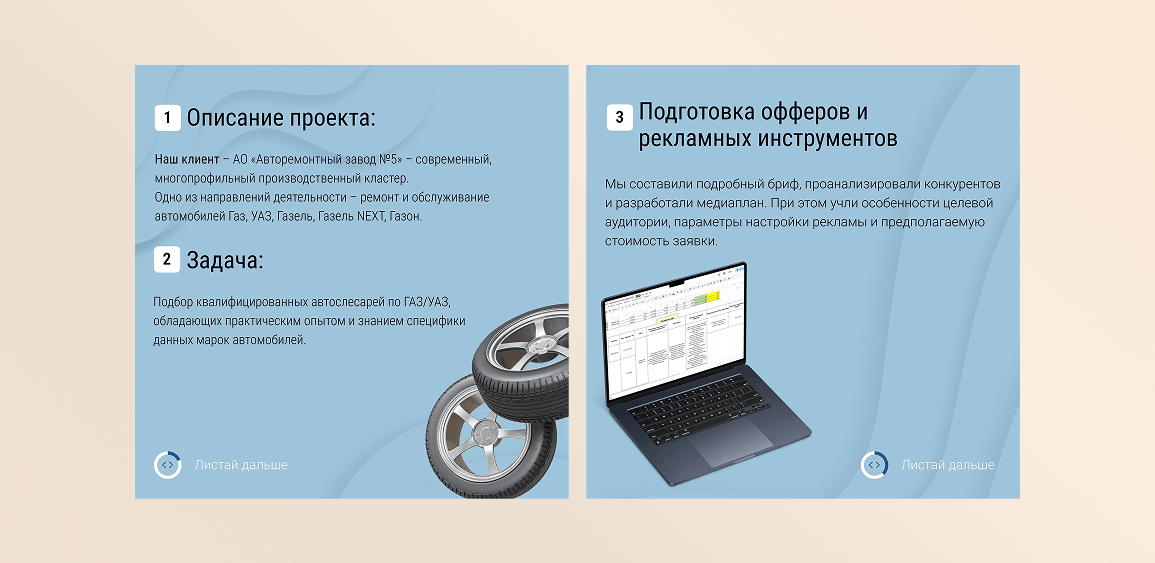 Детальное изучение брифа клиента, анализ рынка труда автослесарей по ГАЗ/УАЗ, исследование предложений конкурентов по зарплатам и условиям работы. Разработка медиаплана, включающего определение целевой аудитории, настройку таргетированной рекламы и расчет прогнозируемой стоимости получения одной заявки.