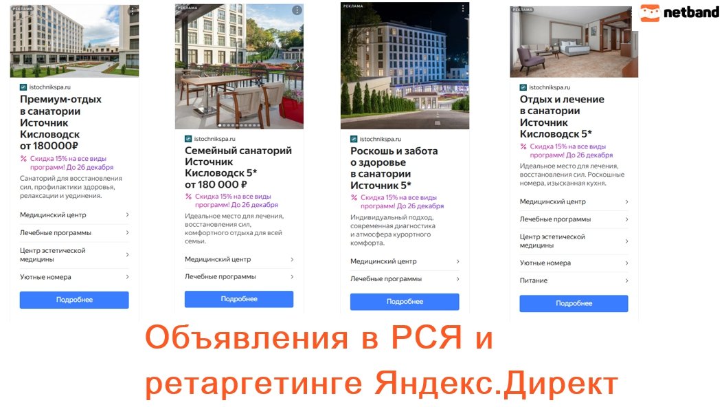 РСЯ по таргетингам: интересы, бренд, конкуренты и ключи – санатории – гео. По всем регионам, которые использовали на поиске.