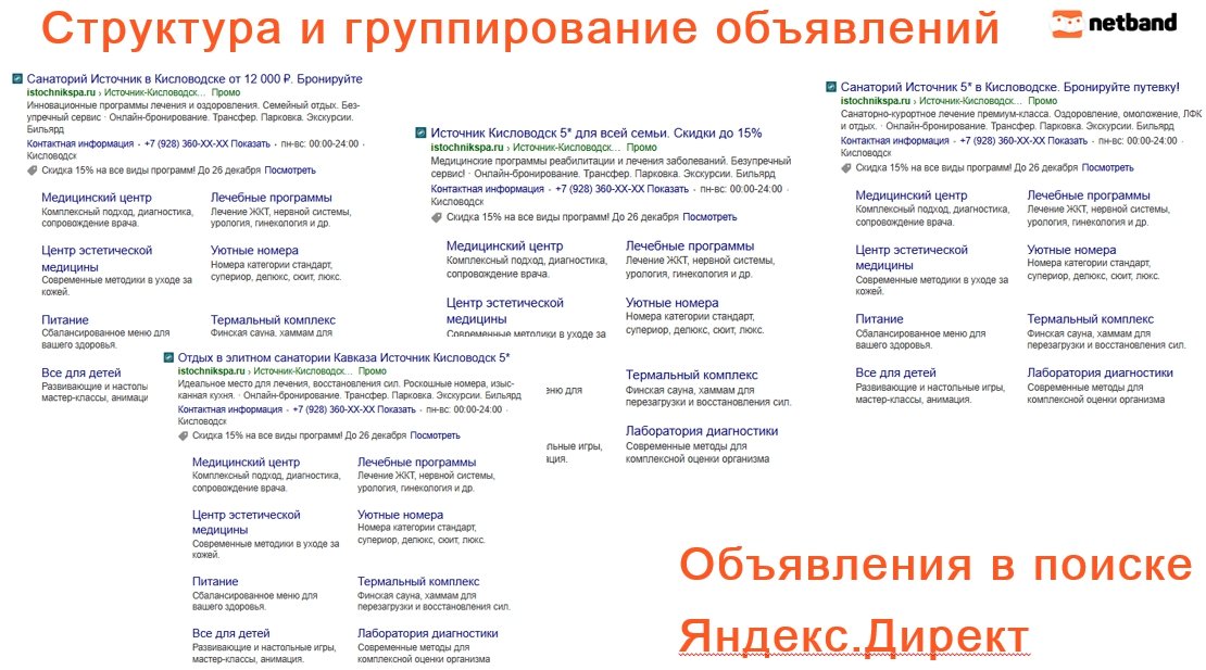2 поисковые кампании по горячим и теплым ключам (санатории-гео-цены, санатории-гео-лечение, санатории-гео-отдых) на Мск иМО и на СПб и ЛО; по городам РФ.