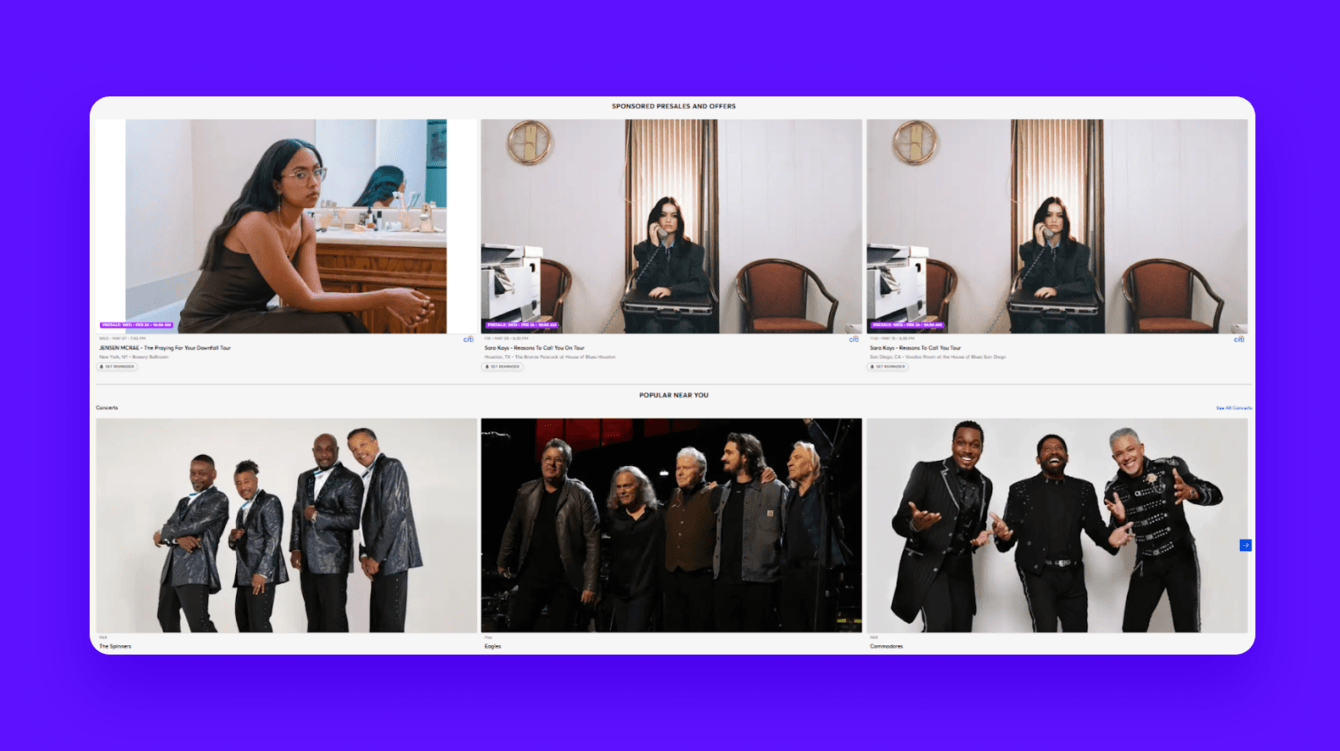 Например, так выглядит сайт TickerMaster — крупный американский сайт для поиска и покупки билетов. Заказчик хотел, чтобы Buzz выделялся на фоне конкурентов: