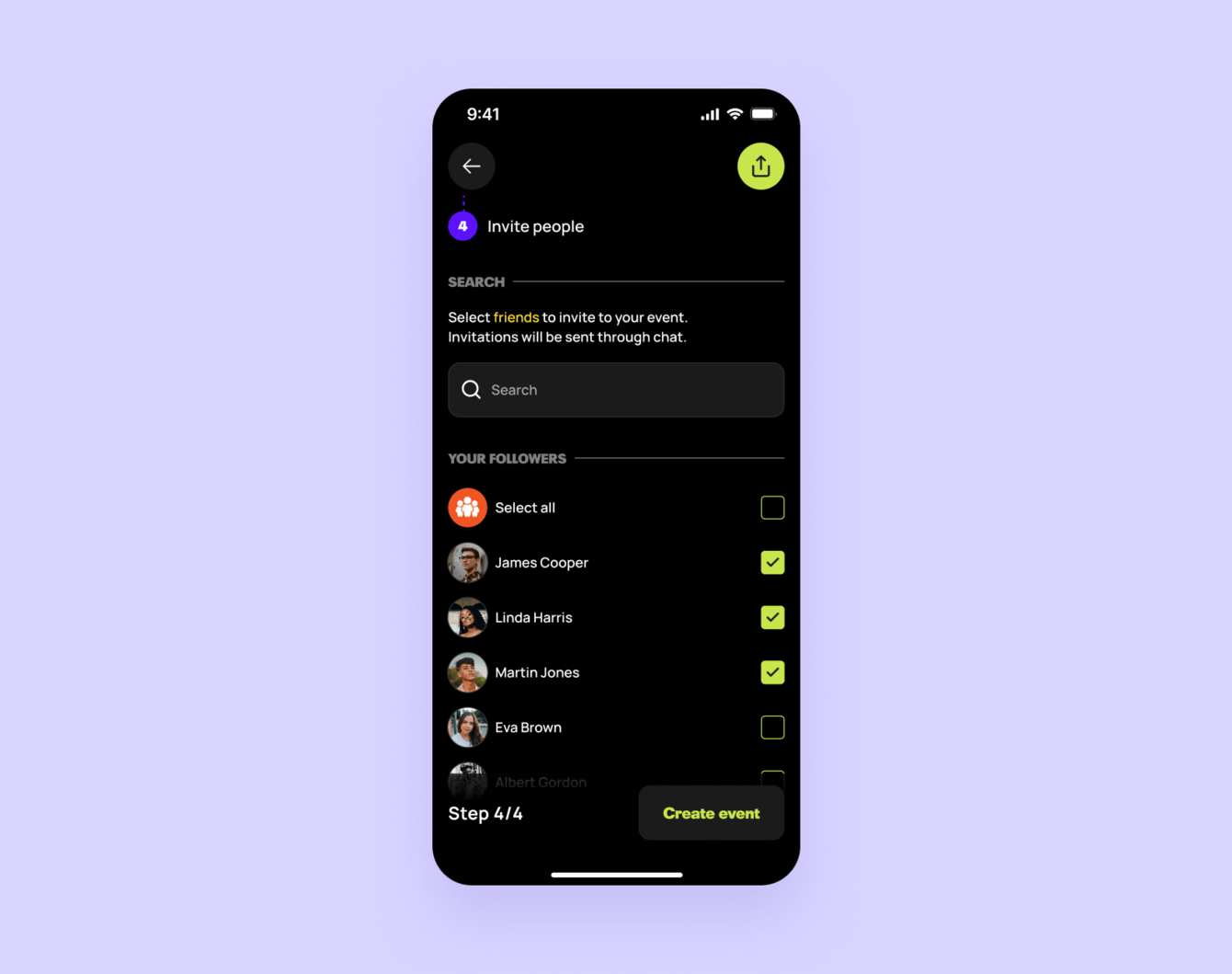 Чтобы создать закрытое мероприятие, юзер проходит такие же шаги, заполняя форму. Но на финальном шаге ему нужно «пригласить людей» — эта опция только для закрытых ивентов.