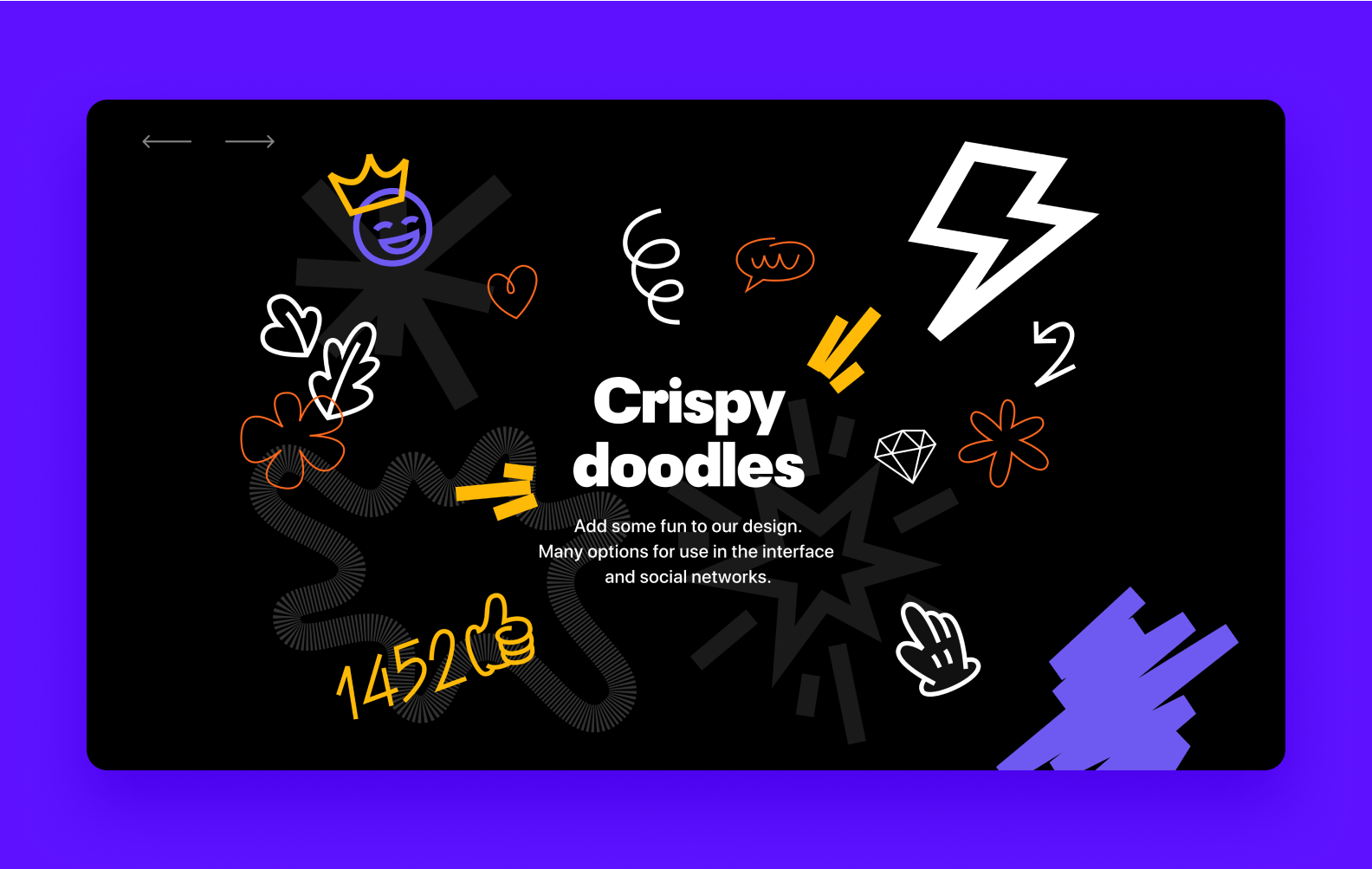Мы предложили использовать в дизайне crispy doodles. Это четкие, детализированные, но при этом слегка небрежные зарисовки, которые добавляют интерфейсу индивидуальность и живость.