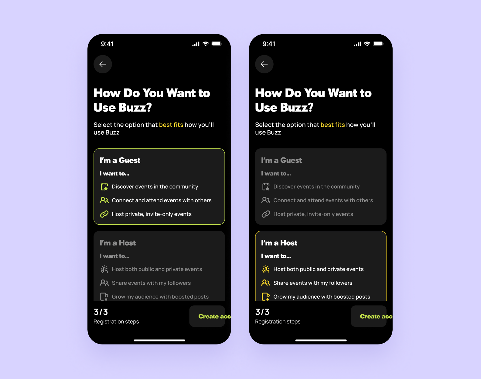 В Buzz есть две роли: хост и гость. Оба могут создавать ивенты, но есть важное отличие: хост создает как открытые, так и закрытые ивенты, а гость может создать закрытое мероприятие, доступное только для друзей.