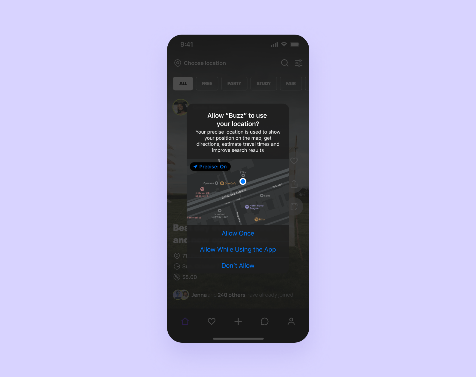 Одна из ключевых фич приложения — лента событий. Для точных рекомендаций нужно разрешить Buzz доступ к местоположению.