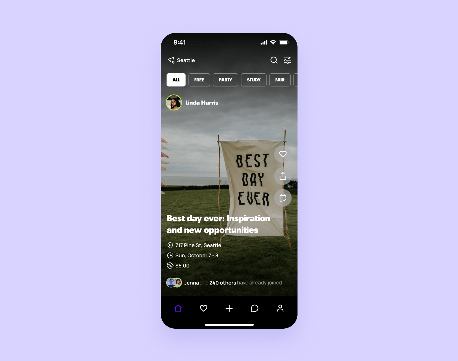 К нам обратился Мэтт, стартапер из США. Он хотел запустить приложение, в котором пользователи из небольших американских городов могут находить интересные мероприятия в своей локации. Также в приложении можно организовать любой ивент и пригласить на него друзей, либо сделать событие открытым для широкого круга людей.
