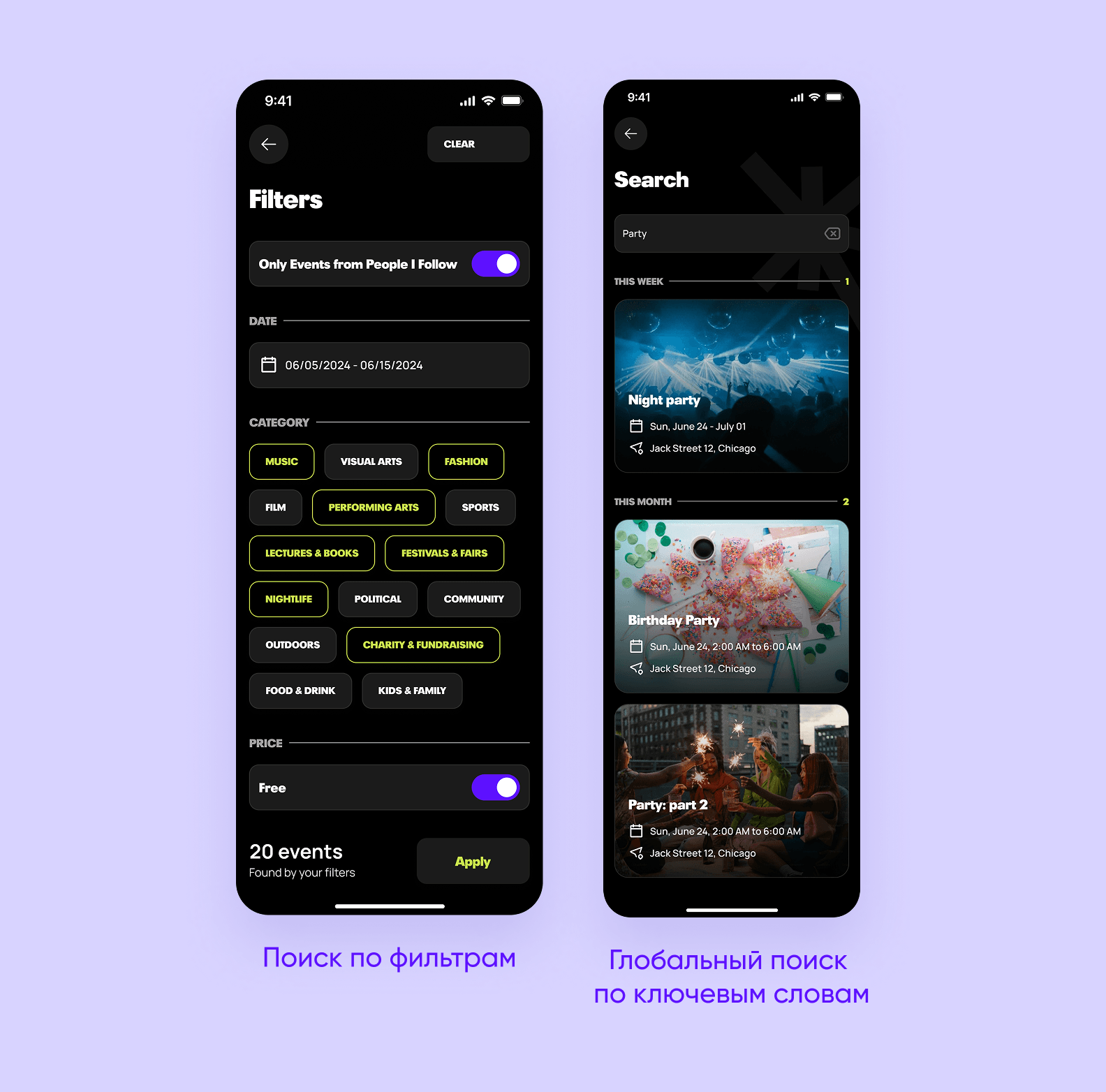 - Геолокация и отображение событий. Локации должны были корректно отображаться как при создании ивента, так и в ленте мероприятий пользователей. Важно было связать события с реальным местоположением, чтобы пользователи видели актуальные ивенты в своем или ближайшем городе. Мы несколько раз пересматривали подход, адаптировали его под UX и технические ограничения, чтобы добиться точного и стабильного отображения.