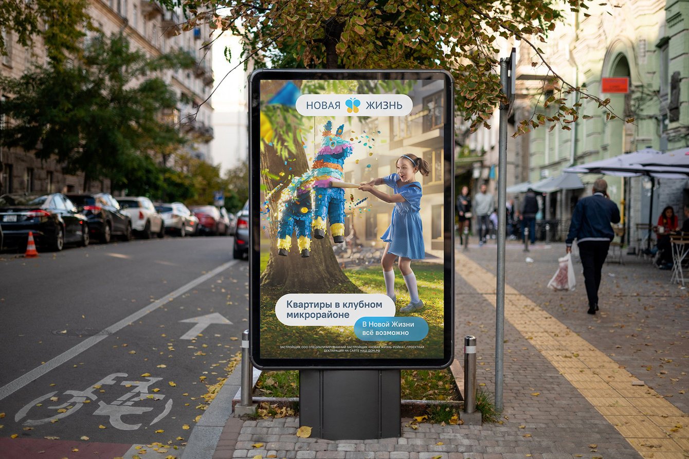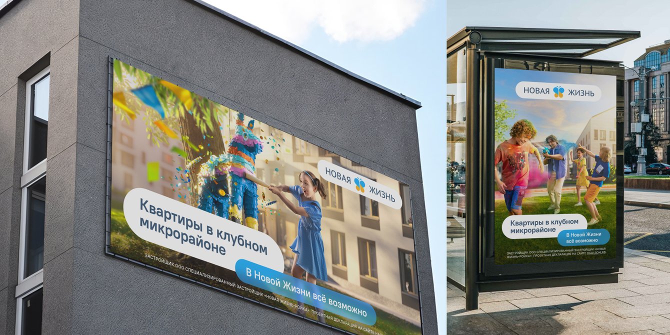 Outdoor-коммуникации были выдержаны в общей стилистике и запечатлели живые, радостные моменты, которые легко считывались аудиторией. Главная идея этих материалов заключалась в том, чтобы вдохновить людей выбрать именно «Новую Жизнь» — место, где можно легко стать частью большого дружного сообщества.