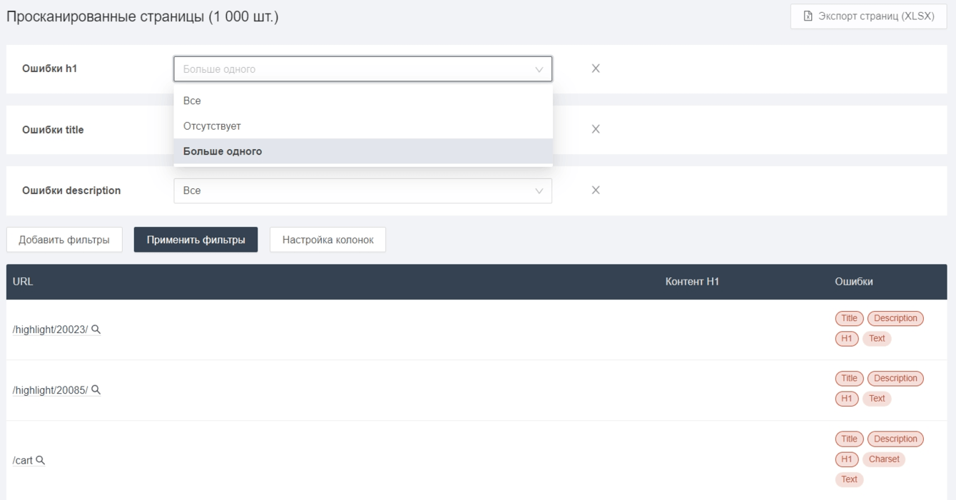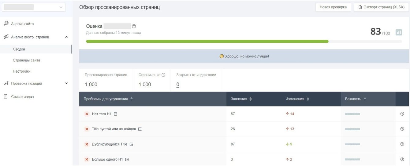 Для выявления внутренних страниц с дублированными метатегами и другими ошибками рекомендуется использовать инструменты вроде "Анализа сайта", в котором присутствует раздел по проверке содержимого внутренних страниц.