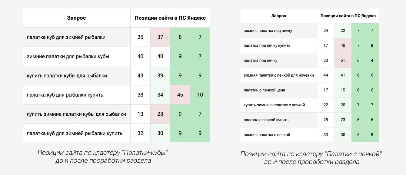 После каждой доработки позиции сайта по отдельным кластерам росли, например, несколько кластеров в зимних палатках для рыбалки: