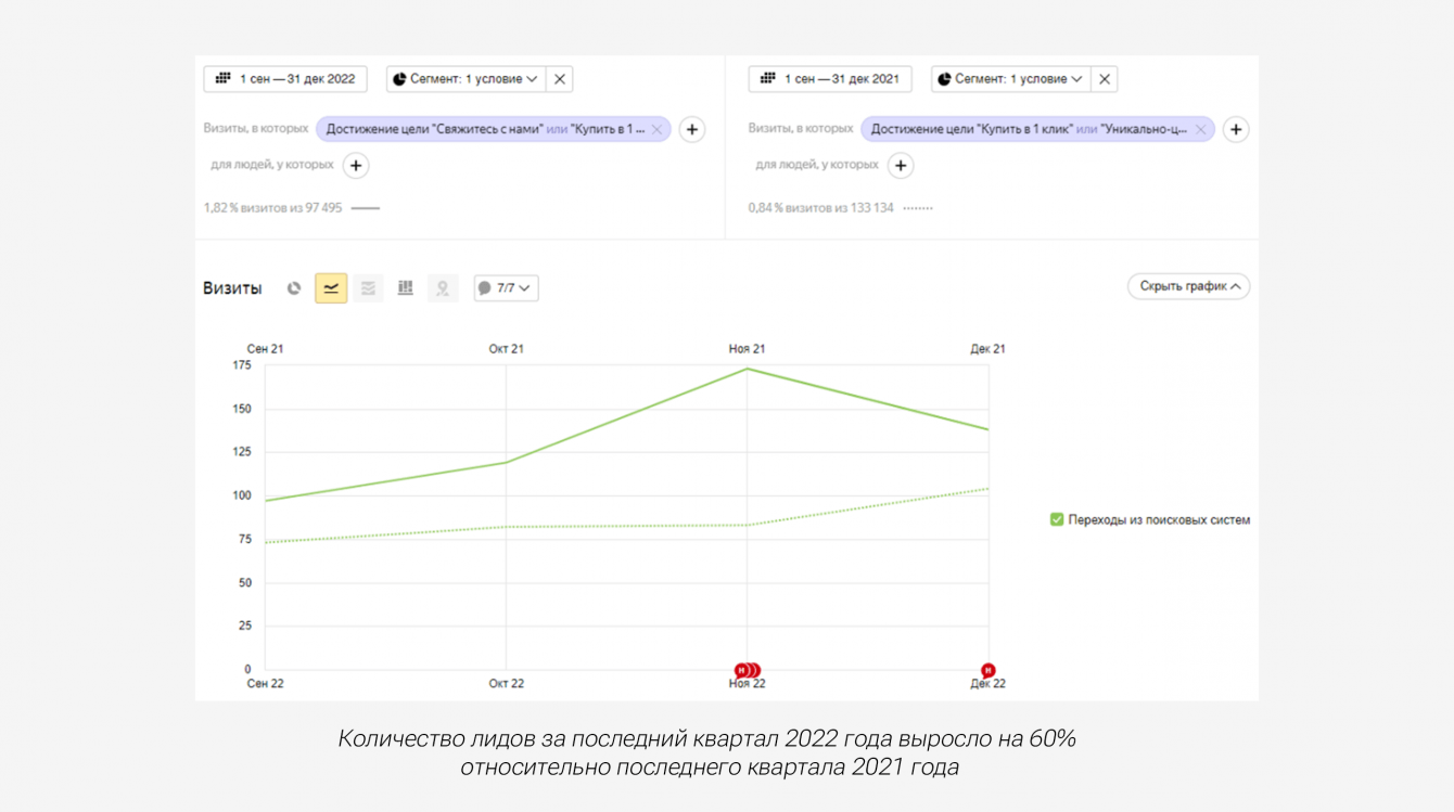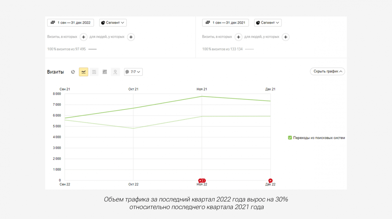 • объем трафика на сайт за последний квартал 2022 года (октябрь, ноябрь, декабрь) вырос на 30% относительно последнего квартала 2021 года;