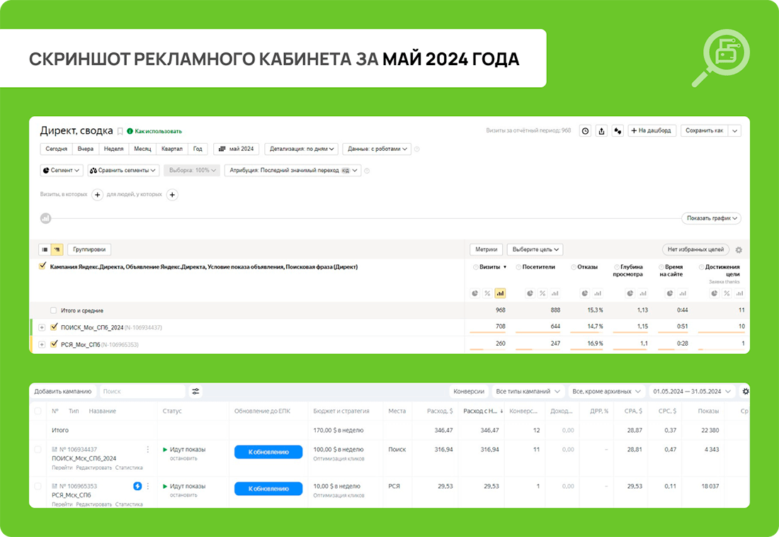 По данным статистики Я.Метрики Поисковая кампания привела на сайт 10 лидов, цена конверсии за май получилась 32 доллара. РСЯ привела 1 лид за 29,5 долларов.