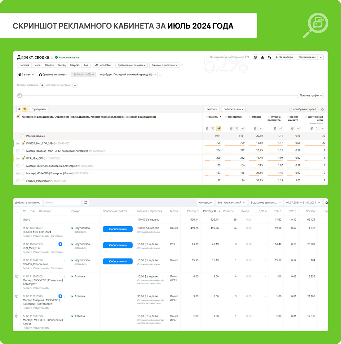 В июле добавили ретаргетинг на посетителей, не оставивших заявку, и запустили три Мастера кампаний с оплатой за конверсии «автотаргетинг», «по ключевым словам» и «товарная кампания».