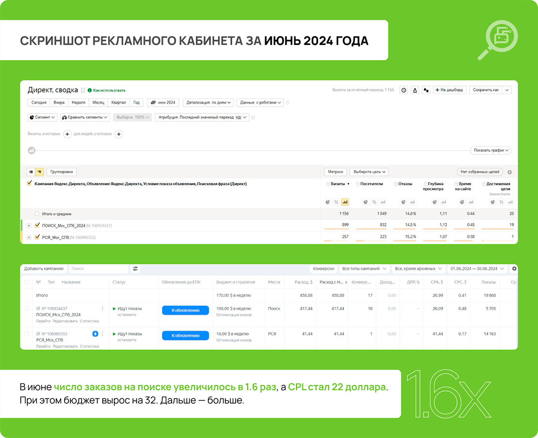 В июне число заказов на поиске увеличилось в 1.6 раз, а CPL стал 22 доллара. При этом бюджет вырос на 32. Дальше — больше.