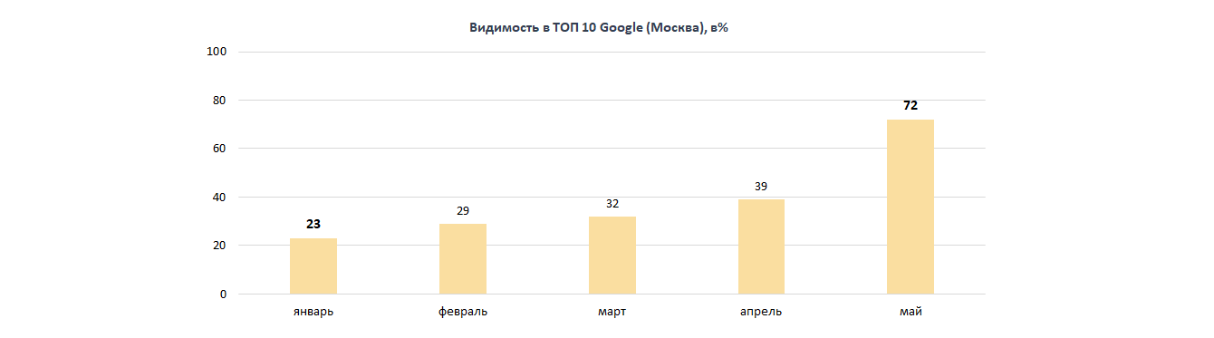 - роста видимости в ТОП 10 ПС Google (Москва) на 49%.