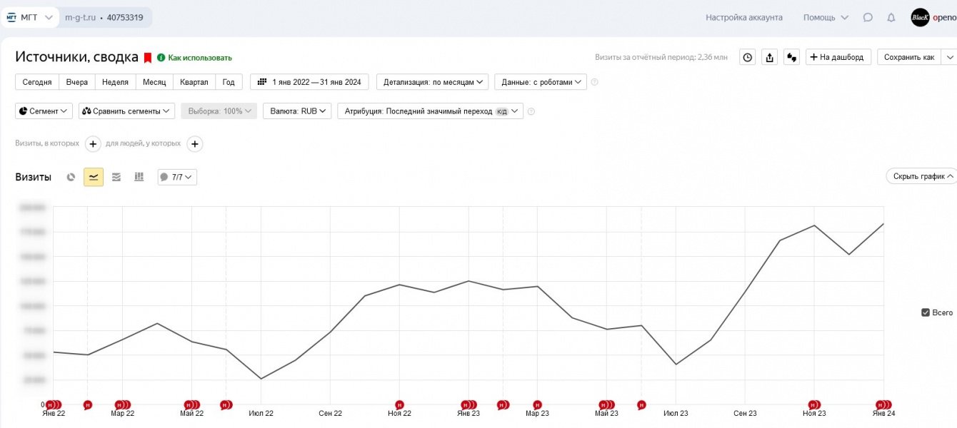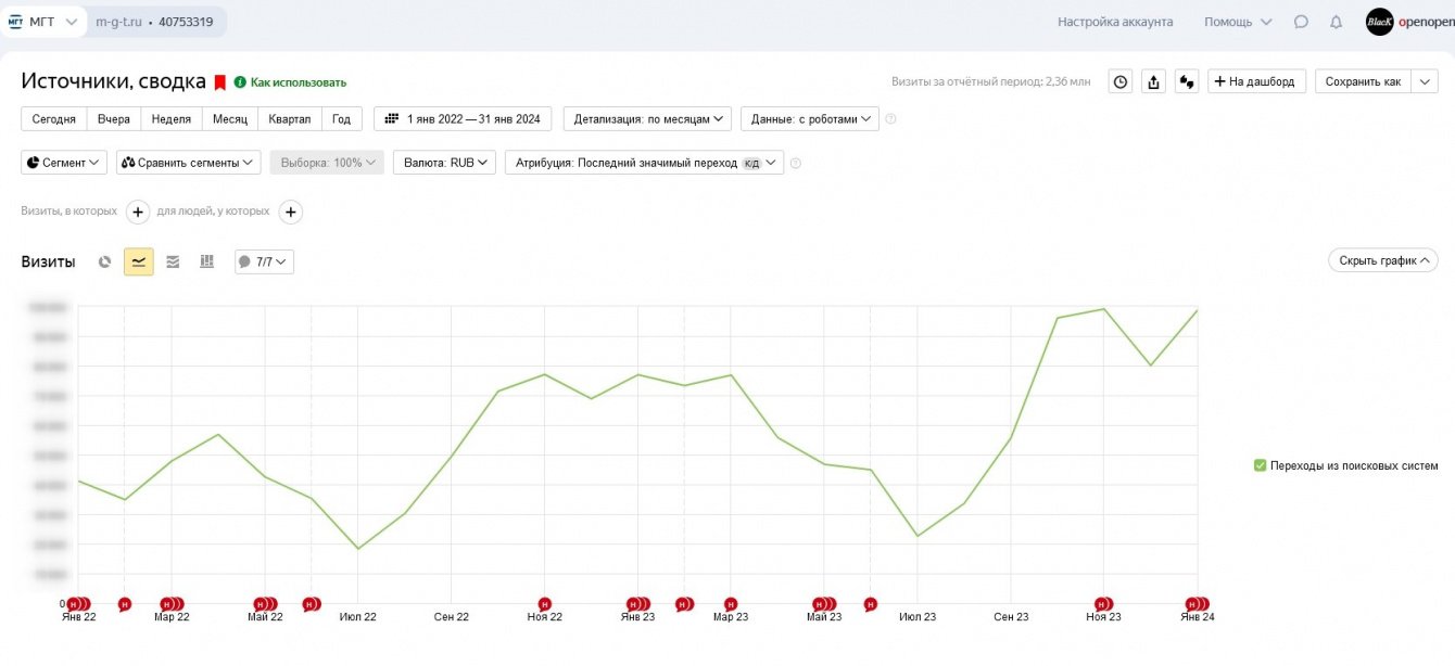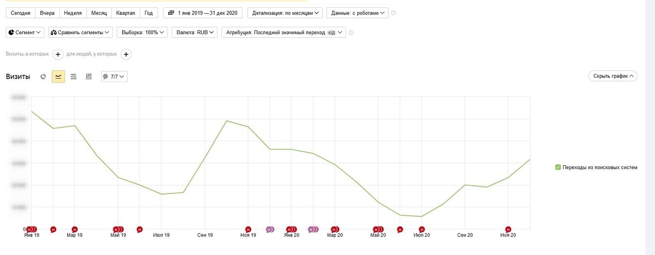 Тут стоит сказать, что работы по развитию сайта сильно расширили аудиторию и прирост трафика пошел уже и по каналу «Прямые переходы». Также нами был задействован канал «Реклама», но по нему мы сделаем отдельный кейс.