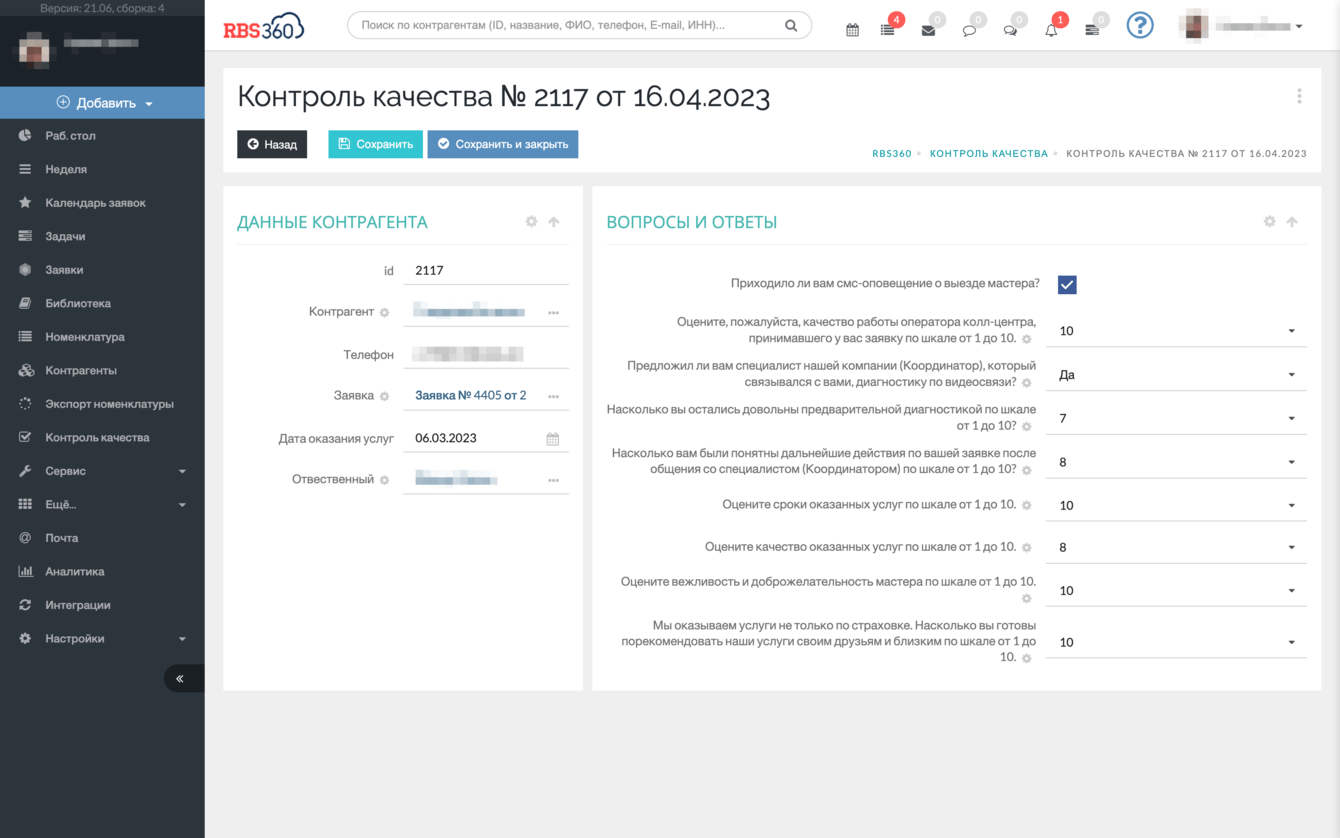 При смене статуса заявки на Контроль качества создается документ с данными о клиенте, шаблоном вопросов и задача менеджеру на звонок.