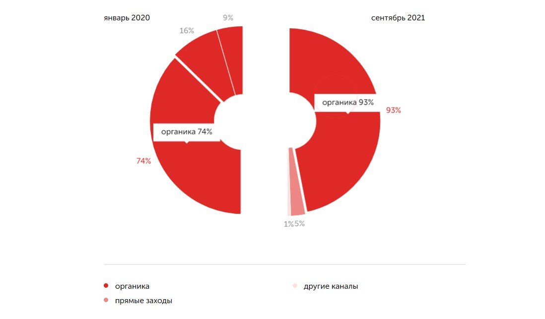 За время сотрудничества доля поискового трафика выросла с 78% до 93,6%. Это значит, что практически весь трафик на сайт приходит из поиска.