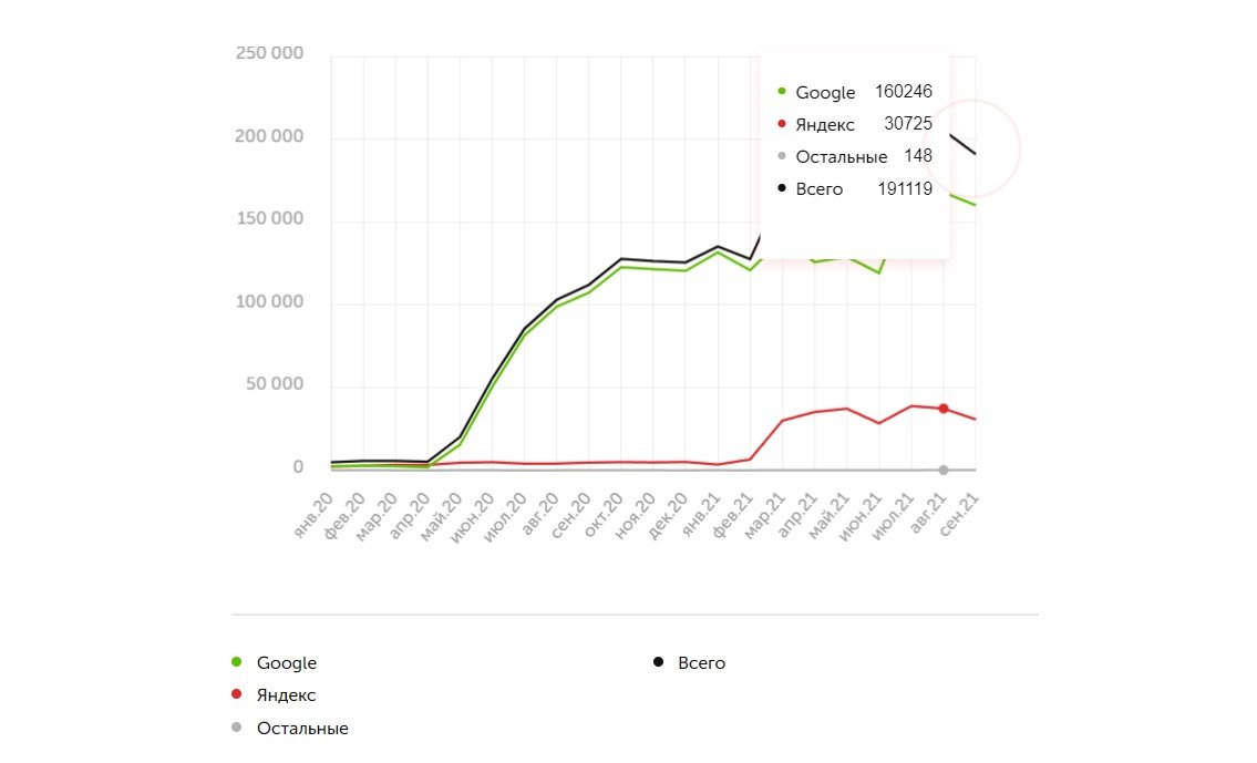 У сайта на момент первичного аудита была минимальная посещаемость — 4–5 000 пользователей за месяц. Проработка EAT и коммерческих факторов стала отправной точкой у популярности сайта и кратко увеличила долю целевого трафика из поисковой выдачи Google и «Яндекс».