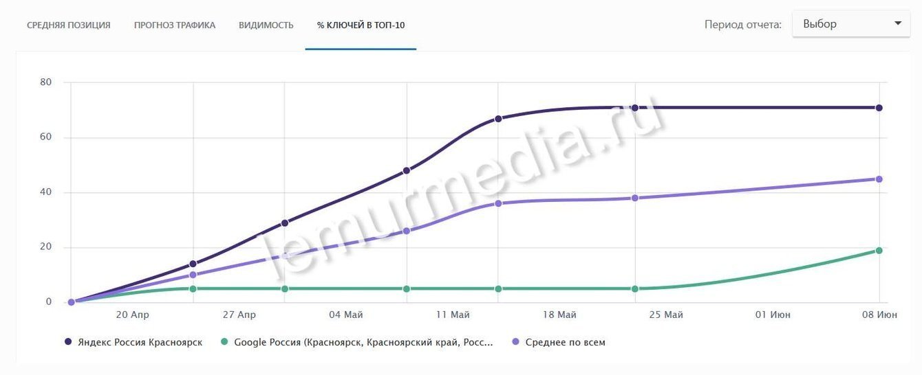 Результатом работ стало: за 1,5 месяца SEO-продвижения мы увеличили на 70% количество ключевых слов в ТОП-10 поисковой системы Яндекс и на 20% количество ключевых слов в ТОП-10 поисковой системы Google.