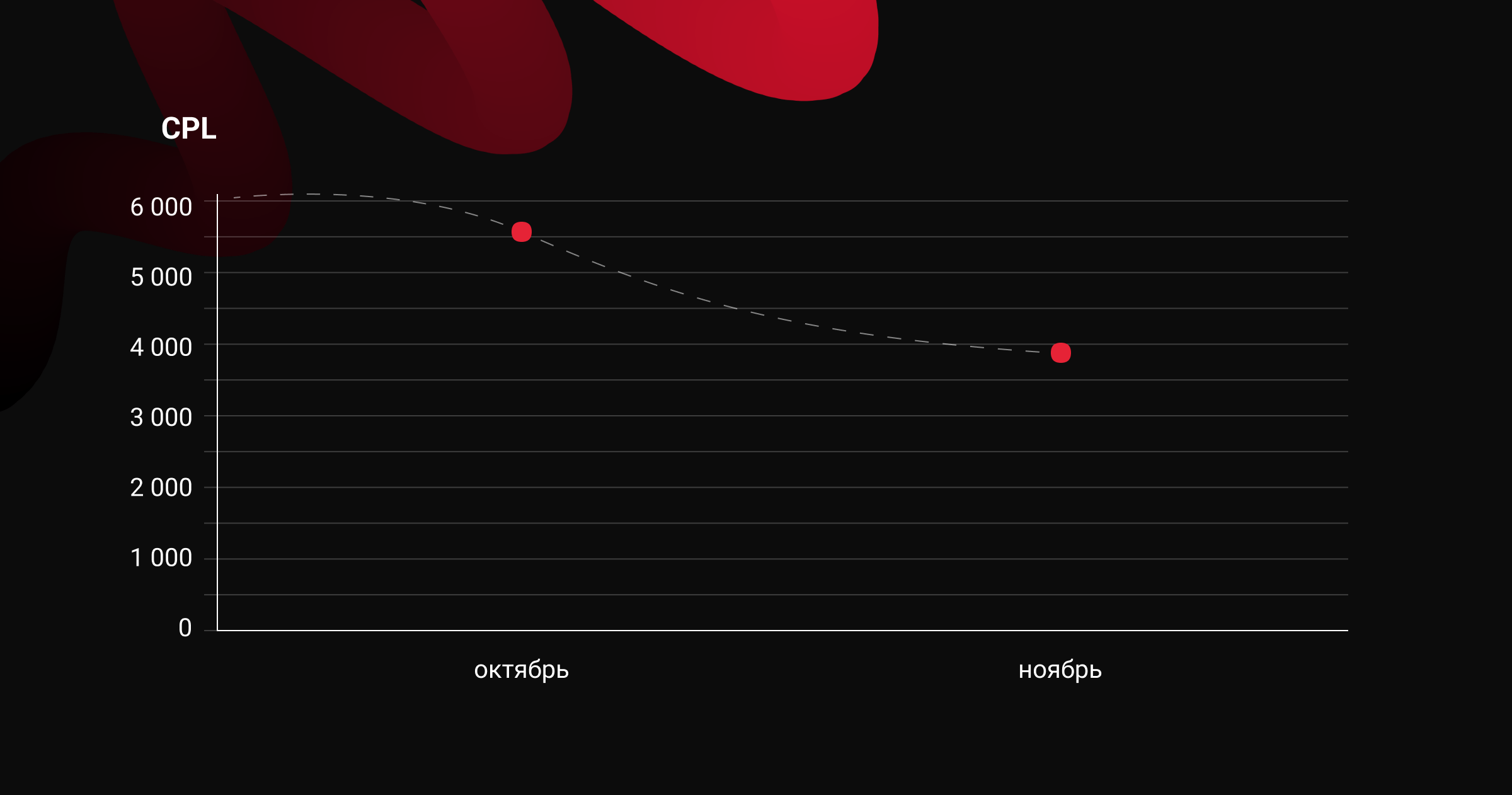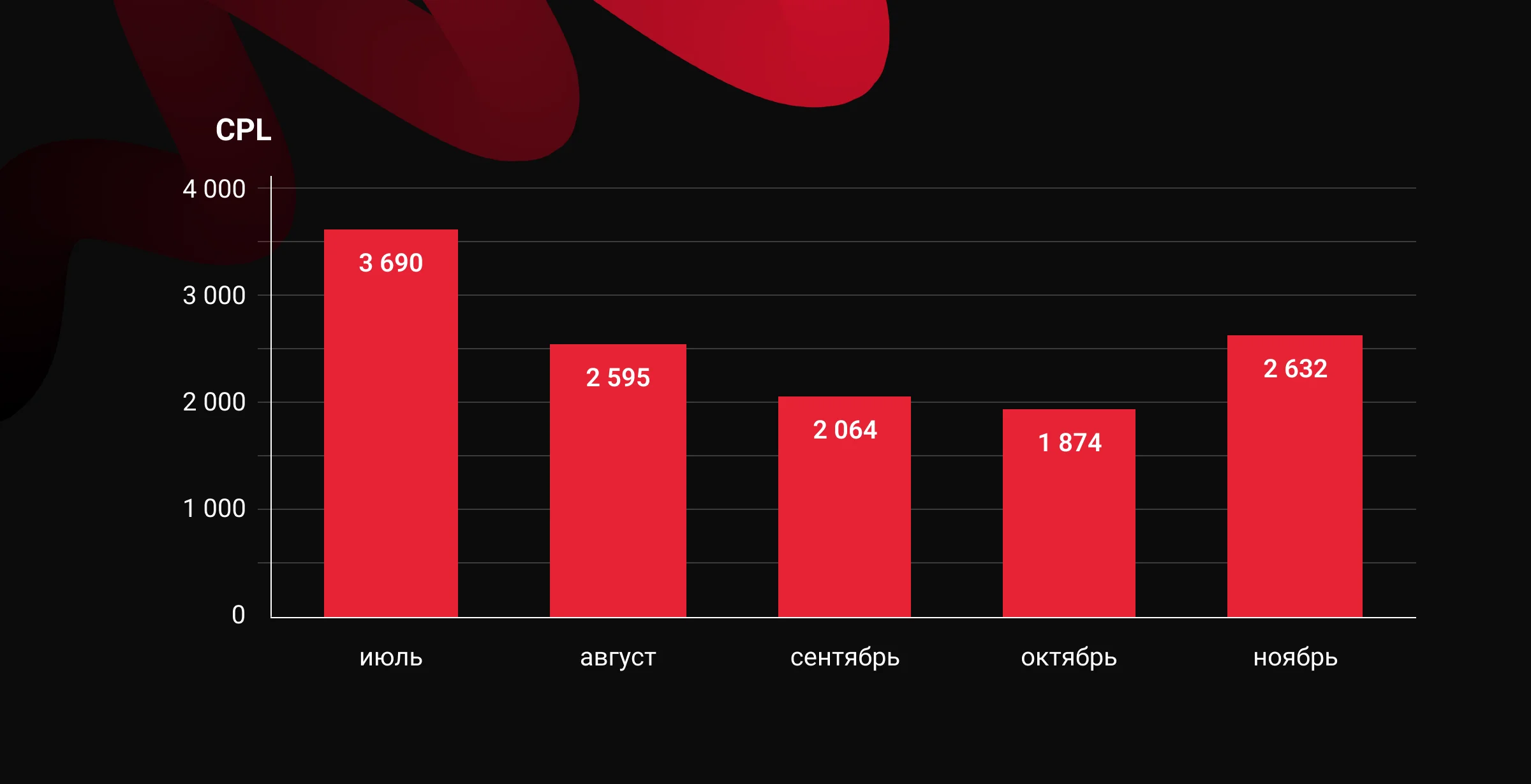 От момента начала сотрудничества до октября нам планомерно удавалось сохранять тенденцию к снижению CPL. Однако в октябре, по инициативе клиента, был перерыв в работе рекламных кампаний, что плохо отразилось на их эффективности в ноябре. Мы всегда предупреждаем клиентов о негативных последствиях остановки РК на срок более, чем на 5−7 дней — алгоритмам приходится обучаться заново.
